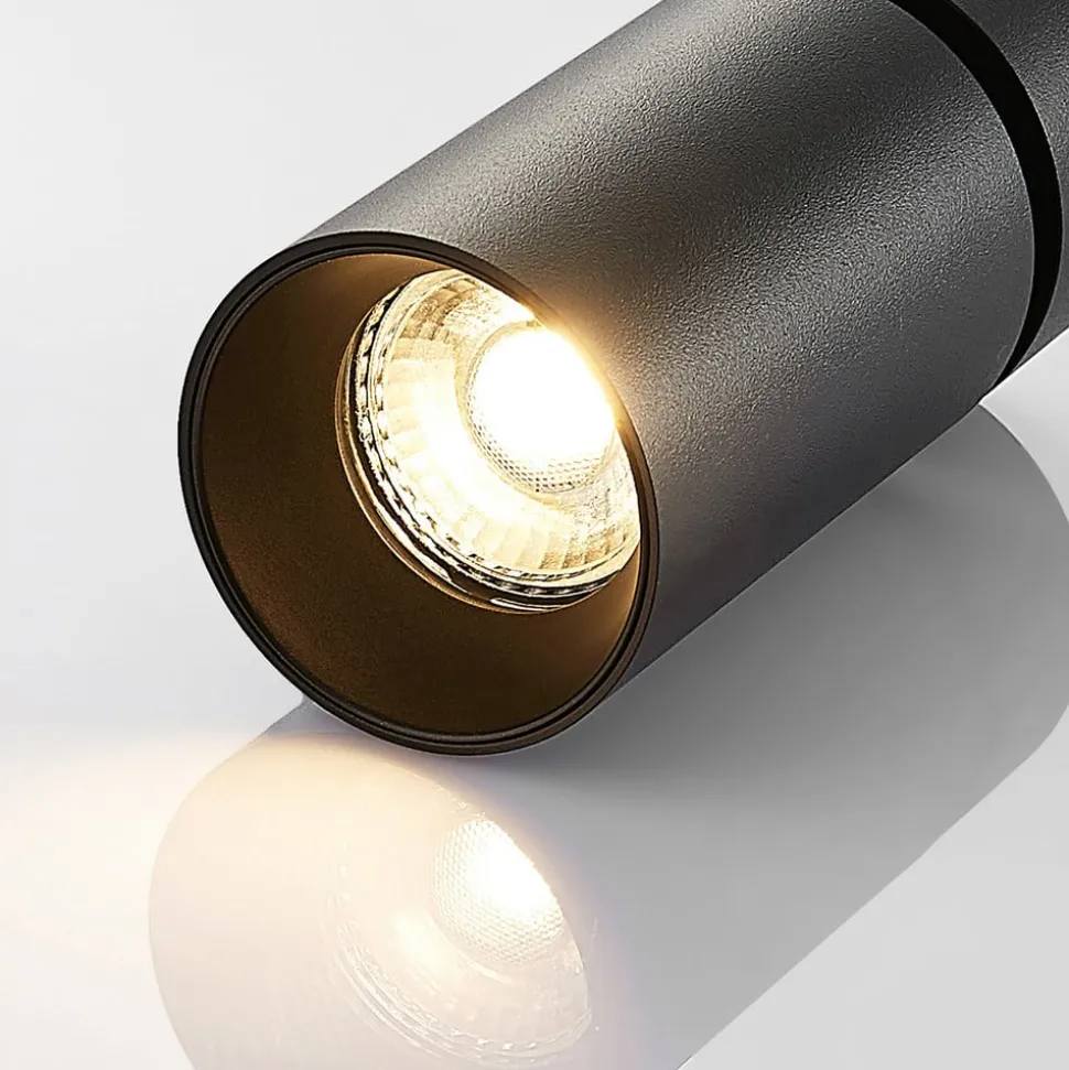 Brinja spotlight i svart i en pakke med 4 stk – inkludert dekorring i svart og gull 1 lyskilde Brinja spotlight går rett i hjertet av lysstemningen. Den enkle taklampen imponerer med sin fleksibilitet og harmoniske design. Både skjermen og den runde holderen er behersket i størrelse og fokuserer i stedet på målrettet belysning. Spotsene leveres med to forskjellige dekorative ringer slik at interiøret kan kles i svart eller gull. Armaturen kan roteres og justeres fleksibelt slik at lyset alltid når frem til ønsket sted og matcher resten av belysningskonseptet. Den blanke, svarte fargen og det lyse aluminiumet fremhever denne attraktive armaturens klarhet. Brinja er tilgjengelig i et sett med 4 stk. i dette tilbudet.