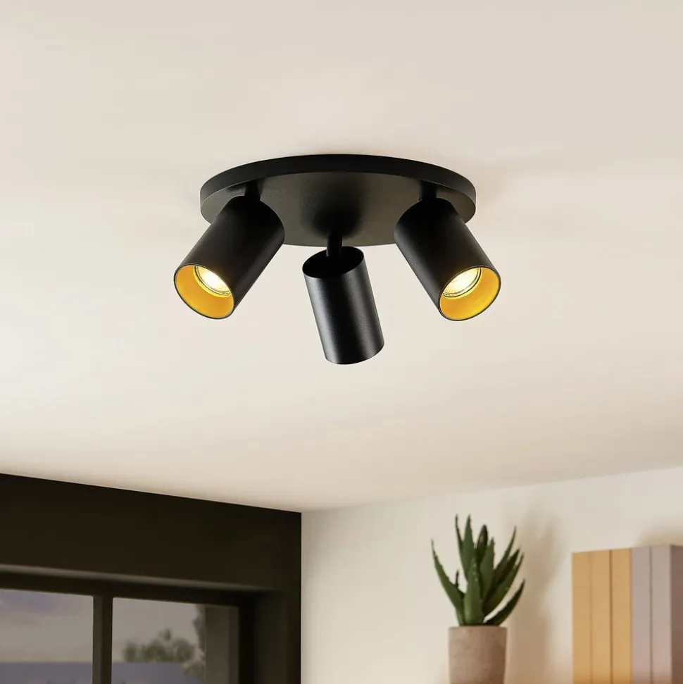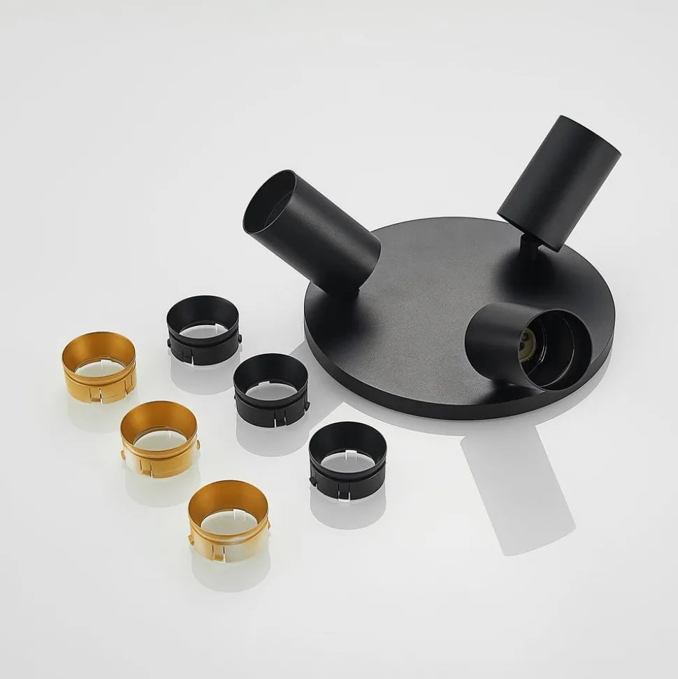 Downlight Brinja består av et rundt takfeste med tre lyskilder i sylindrisk form festet til. Disse kan utstyres med GU10-pærer etter ønske. De tre spotthodene kan vippes fleksibelt opptil 90 grader og dreies opptil 350 grader, noe som sikrer presis belysning av bestemte områder eller objekter i rommet. I tillegg følger det med sorte og gullfargede dekorringer til spotlightene.