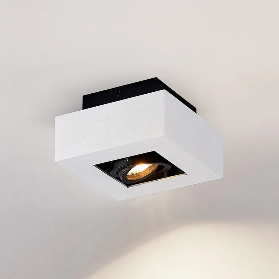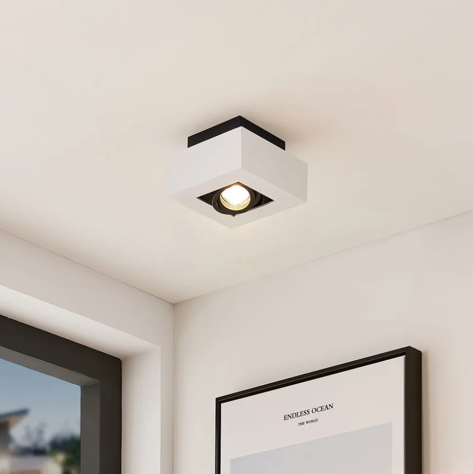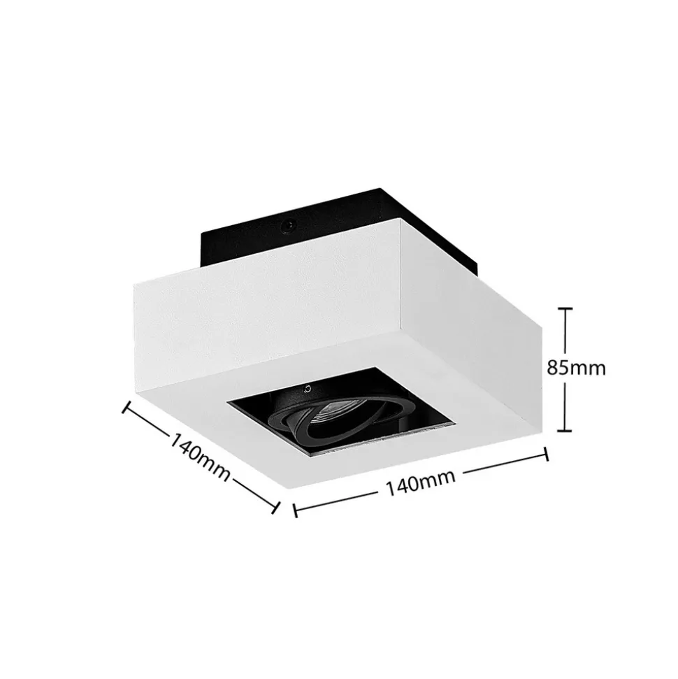 Kvadratisk Vince taklampe med vippbar innsats Den praktiske taklampen Vince er et minimalistisk og moteriktig tilbehør til hjemmet. En enkel hvit farge er valgt til huset, mens lyskilden er omgitt av en svart omramming. Downlighten er designet i et klassisk fargevalg og en kubisk form, og kan enkelt integreres i en rekke ulike møbleringsstiler. Fordelen med denne armaturen er at du kan rette lysretningen etter behov, ettersom spotlighten kan svinges fleksibelt. En energibesparende LED-pære kan settes inn i GU10-fatningen, som er tilgjengelig separat som tilbehør. Taklampen har en skruefri tilkoblingsklemme for rask, praktisk og verktøyfri tilkobling av ledningene.