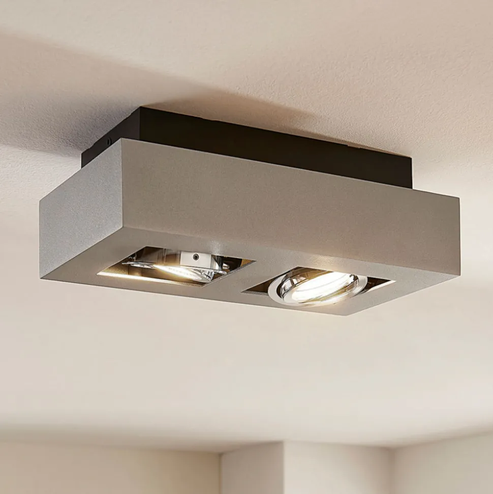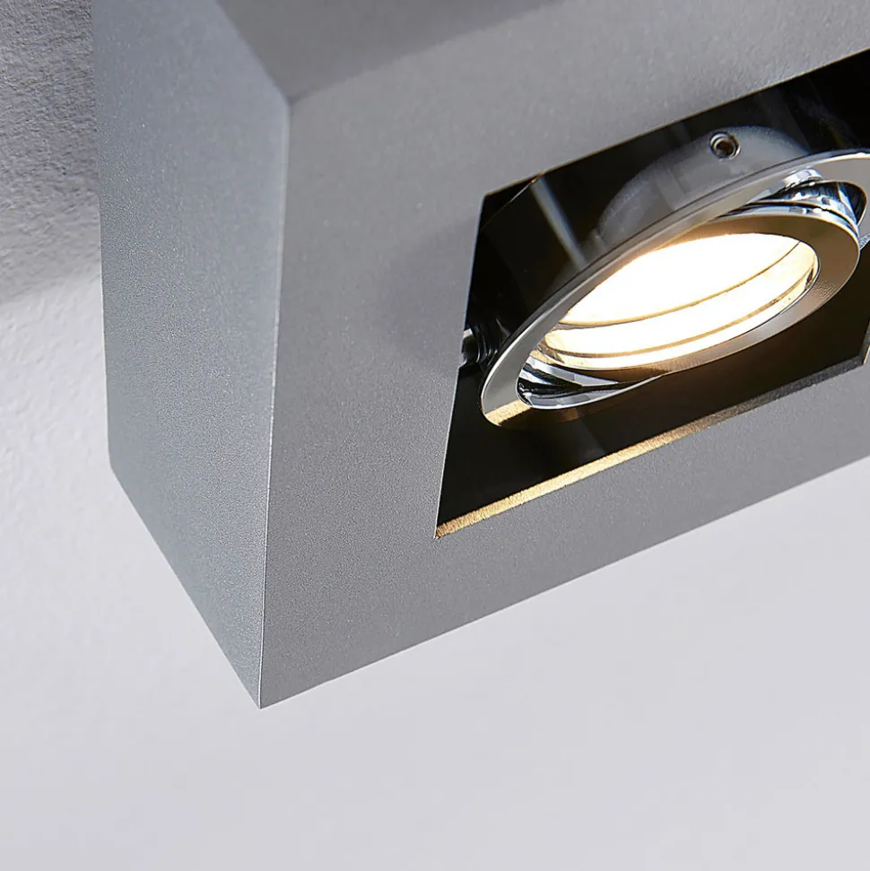 Sølvgrå Vince taklampe i 2 lyskilder De justerbare spotlightinnsatsene kjennetegner Vince taklampe, som kan brukes til mange formål i oppholdsrommet. Den kan monteres i gangen, på kjøkkenet, i arbeidsrommet eller i oppholdsrommet. De justerbare innsatsene gjør det mulig å individualisere lysretningen. Overflaten er lakkert sølvgrå, noe som gir Vince et spesielt tidløst utseende som taklampe – med høykvalitets, skruefri hurtigkoblingsklemme (holdbar, sikker og verktøyfri fjærmekanisme)
