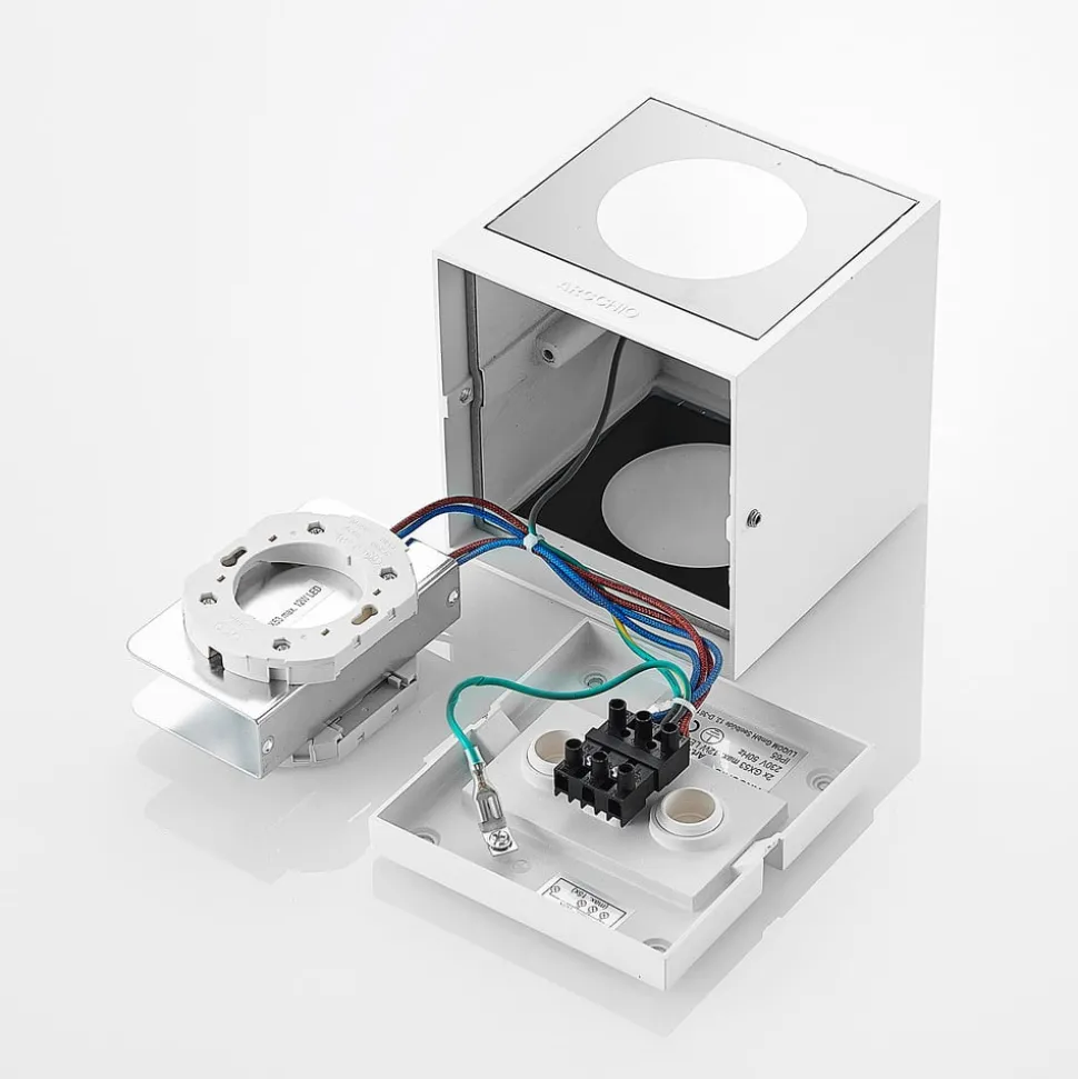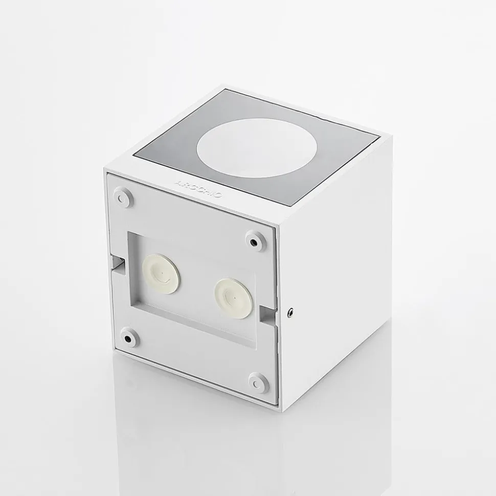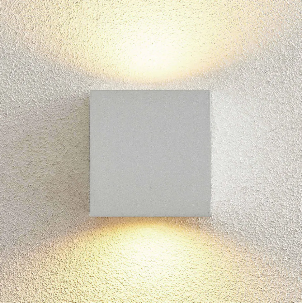 Hvit utendørs vegglampe Tassnim av aluminium i kubeform Utendørs vegglampen Tassnim imponerer med sin moderne og symmetriske design. Den er laget av hvit aluminium, og armaturhusets utside minner om en kube. Med riktig lyskilde får du en pålitelig belysning av uteplassen eller oppkjørselen. IP65-klassifiseringen gjør lampen beviselig støv- og vanntett. Disse egenskapene gjør at Tassnim utendørs vegglampe er perfekt for utendørsarealer og trosser vær og vind. Det enkle utseendet gjør den også perfekt til bruk på yttervegger uten å overskygge resten av arkitekturen.