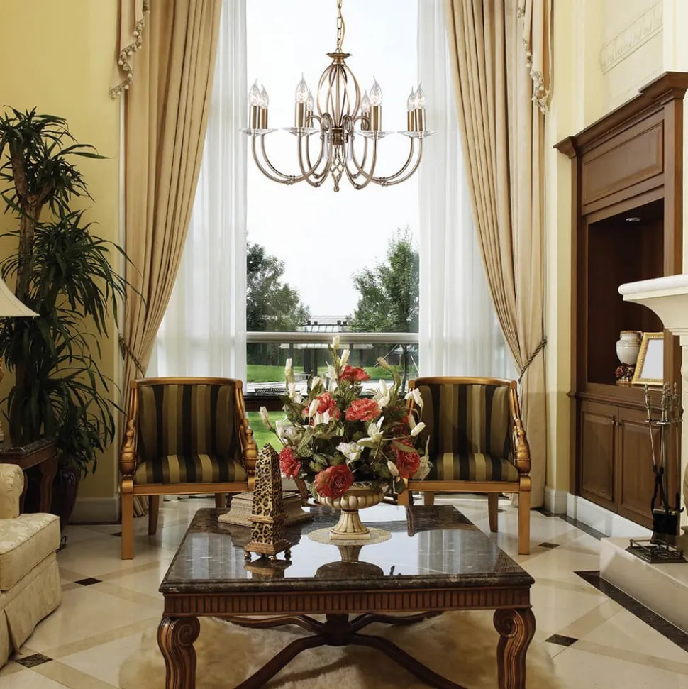 Om den brukes som tradisjonell lysekrone eller som avstands-taklampe – Aegean ser rett og slett fantastisk ut. Lysarmene på stellet er utarbeidet for hånd og lakkert med en overflatebehandling som bærer navnet “Aged Brass”. Lysekronen Aegan har 8 lysestaker som virker penest når de utrustes med vindstøt-lampelysene (60 W, E14) som utstråler et meget behagelig lysskjær. Lyspærene følger ikke med i leveringen, men kan bestilles separat under tilbehør.