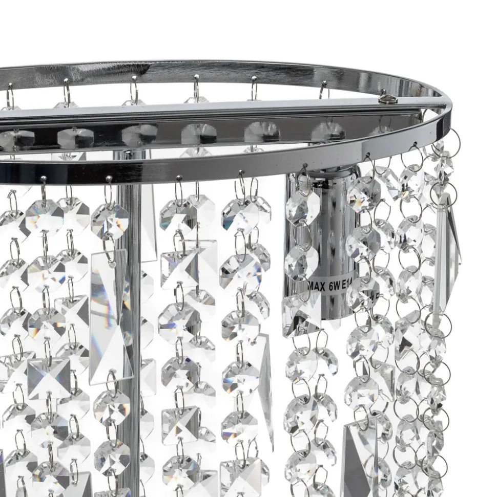 Bordlampen Laila kombinerer moderne design med luksuriøse krystallpendler og setter stilfulle detaljer i ethvert rom. Lampen er laget av høykvalitets jern og glitrende K9-krystallglass og skinner i en elegant kromfinish. Konstruksjonen med 2 lyskilder sørger for en jevn og imponerende lysfordeling som skaper en spesiell atmosfære både i stuen, soverommet og spisestuen.