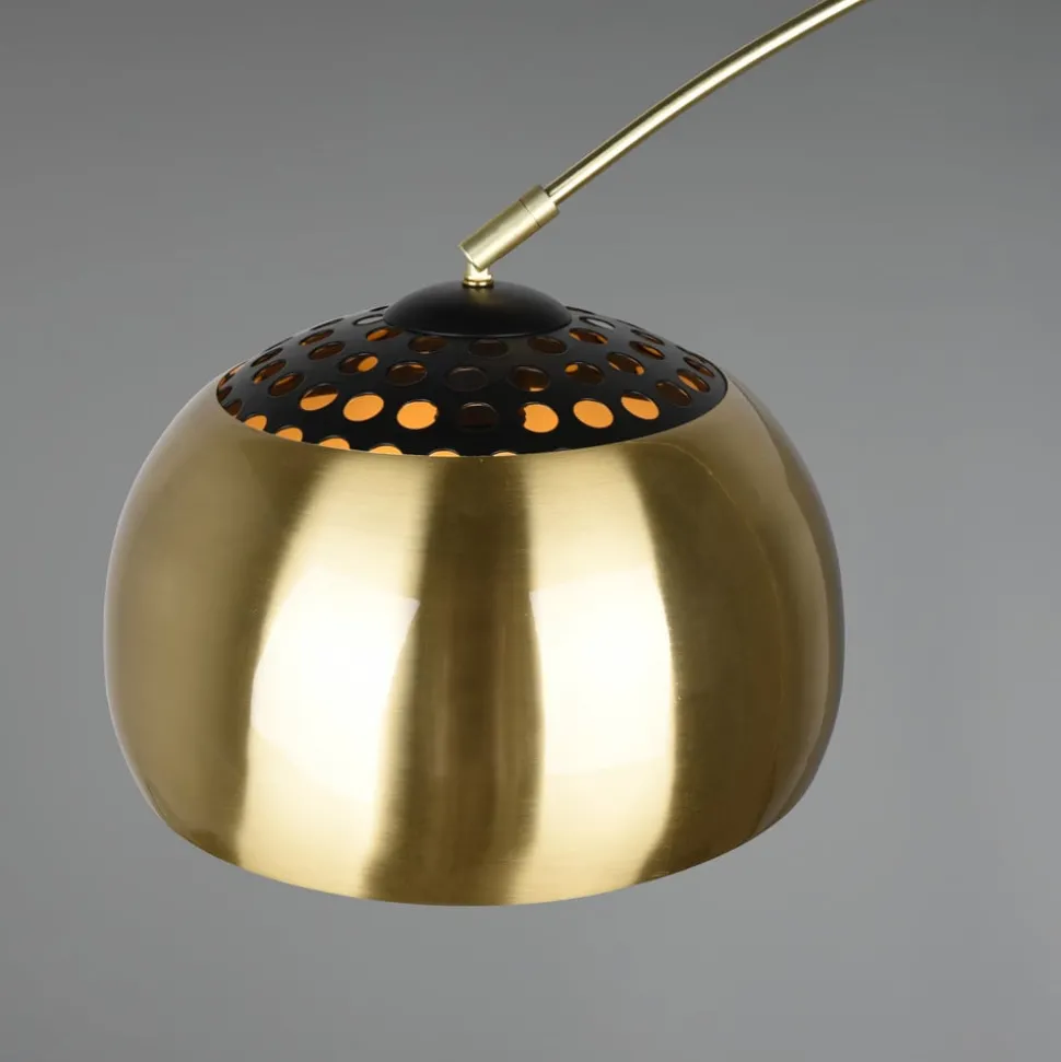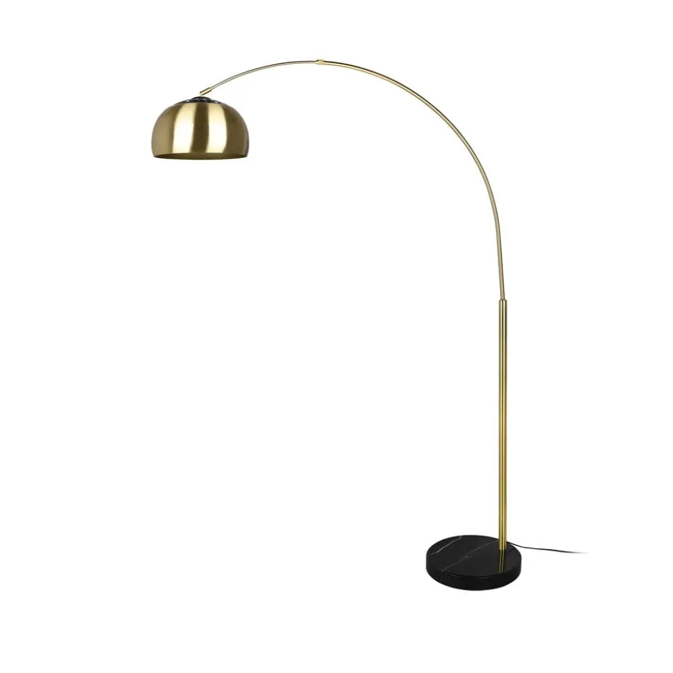 Argentina buet gulvlampe med fotbryter Argentina buet gulvlampe er laget av metall og står på en rund base i svart med marmormønster. Rammen og skjermen er lakkert i en messingfarge. Toppen av skjermen er utstyrt med en silelignende skjerm. Argentina leveres uten lyskilde, så lyseffekten kan tilpasses ved å velge en passende E27-lyskilde. Passende E27-lamper er tilgjengelig separat via tilbehøret. Denne buelampen kan enkelt slås av og på med fotbryteren som er integrert i kabelen.