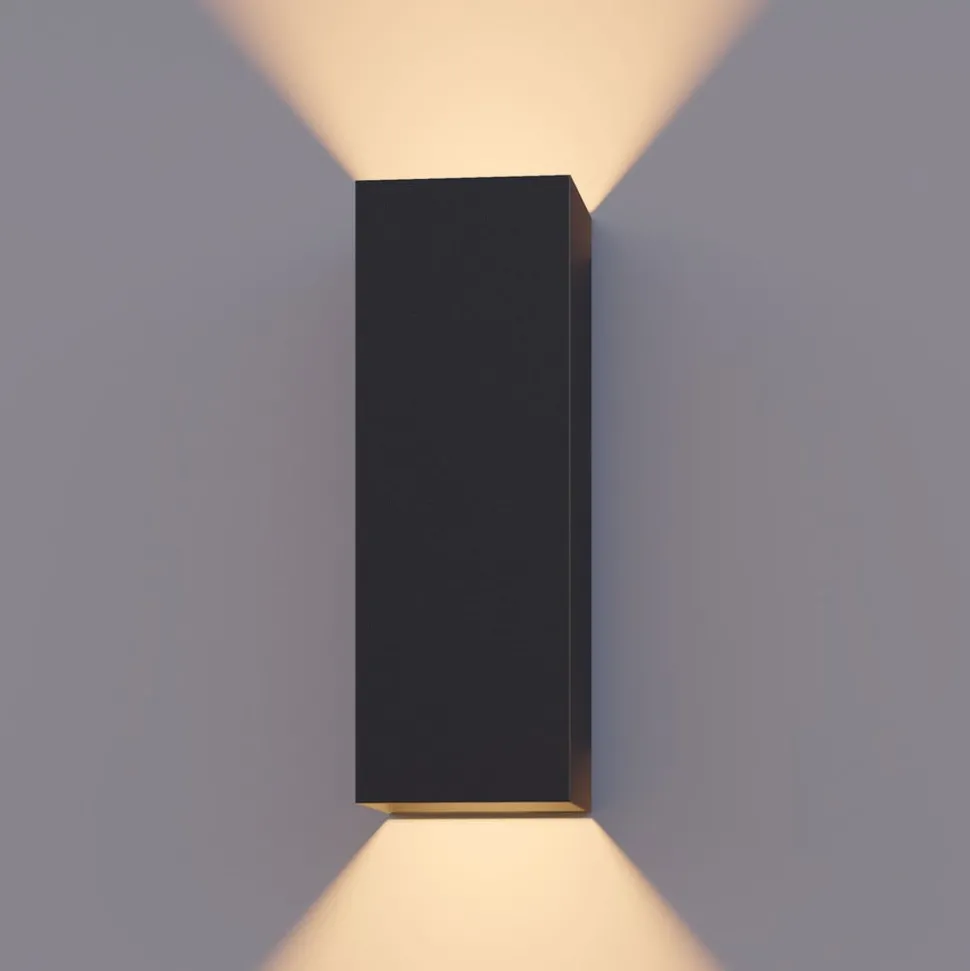 Rektangulær kuboid LED-vegglampe med glassdeksel, topp- og bunnfordeling Rektangulær utendørs vegglampe brukes til moderne aksent- og orienteringsbelysning på fasader og inngangspartier. Armaturhuset i aluminium har en enkel, høy, kubisk form med svart finish. To varmhvite LED-lyskilder er beskyttet bak glassdeksler og avgir lys både oppover og nedover – Kapslingsgrad: IP54 – Inkluderer LED-driver med konstant strøm (av/på)