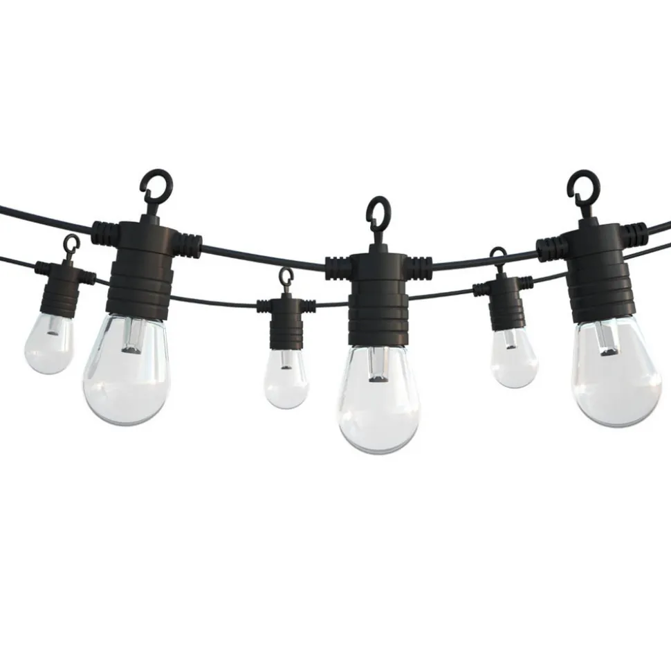 Smart lyslenke til fest utendørs: Smart Outdoor Partystring LED-pære, 10 meter, RGBW Smart Outdoor Partystring LED-lyskæde har 10 individuelle lys som kan styres individuelt. Du kan velge mellom varmhvitt lys (3 000 K) og over 100 andre fargerike lysfarger. Lysintensiteten kan også dimmes. For intelligent lysstyring kreves en Calex Smart Outdoor Link Bluetooth Mesh Gateway, som er tilgjengelig separat som tilbehør. Når gatewayen er koblet til hjemmets Wi-Fi, oppretter den en Bluetooth-forbindelse med lyslenkene. Når den er tilkoblet, kan alle funksjoner enkelt styres via gratisappen. På denne måten kan du også stille inn tidtakere og forhåndsinnstilte lysscener. Smart Outdoor Partystring har en total lengde på 10 meter og drives av en støpsel. Et HighLight til enhver utendørs fest, men egner seg også til innendørs bruk. Tekniske egenskaper/kompatibilitet: – Kan styres via Calex-appen (gratis for Android og iOS) – Over 100 fargerike lysfarger og varmhvitt lys (3.000 K) – Lysfarge kan styres separat for hver lampe – Timer og forhåndsinnstilte scener kan stilles inn via appen – Stemmestyring mulig med Amazon Alexa, Google Assistant og Siri Shortcuts – Dimbar via app eller stemmekommando Merk: En Calex Smart Outdoor Link Bluetooth Mesh Gateway (se tilbehør) og et eksisterende Wi-Fi-nettverk er nødvendig for intelligent lysstyring.