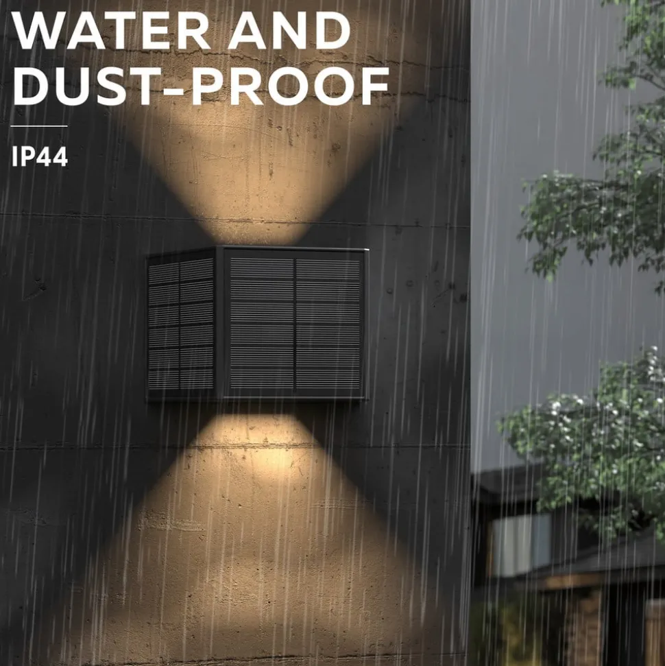 Lampen avgir varmhvit lys oppover og nedover og skaper et stilig, lekent lysbilde på vegger og gjerder. Den justerbare lysvinkelen (115° oppover, 35° nedover) gir fleksibel lysfordeling.
