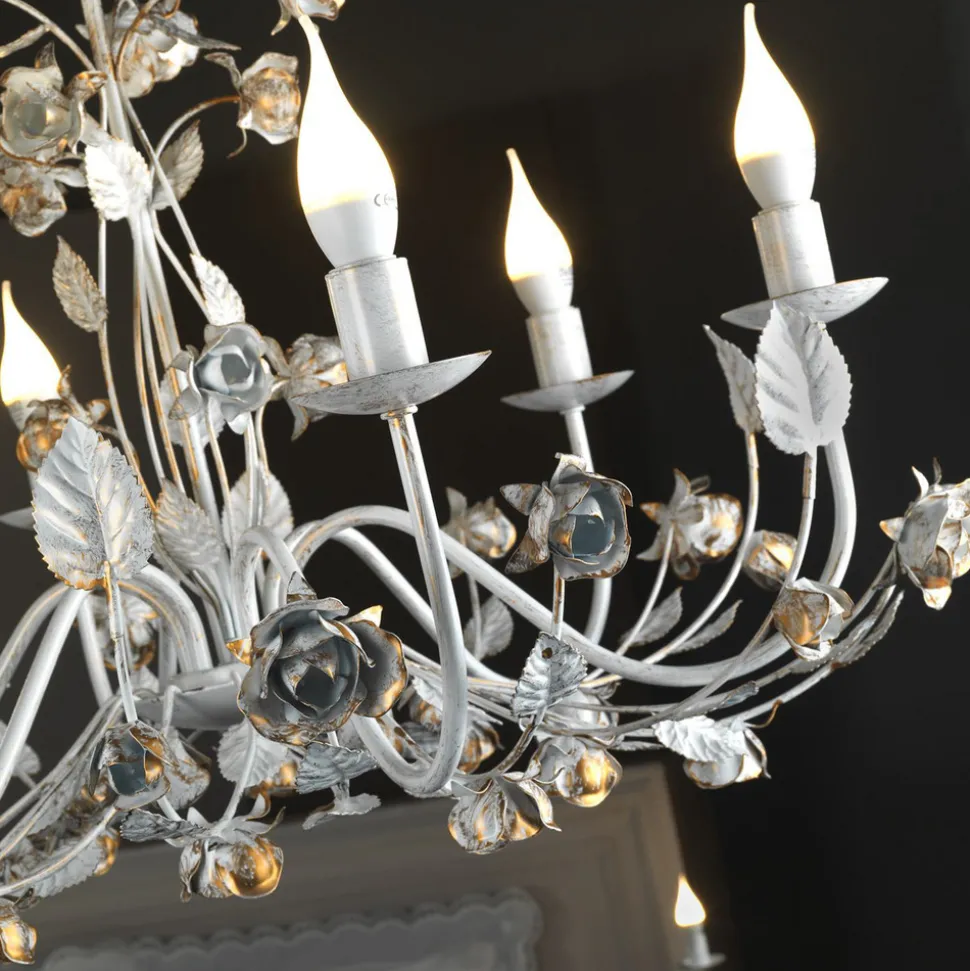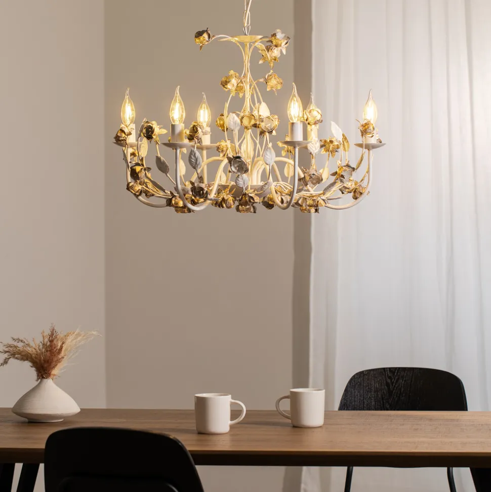 Carolina lysekrone: eleganse og florentinsk stil til stuen Carolina lysekrone, som er laget av jern, er selve symbolet på den florentinske stilen i sin reneste form. Med sin elfenbensfargede overflate og seks kunstnerisk utformede lamper tilfører den en tidløs eleganse til enhver stue eller spisestue. Det omhyggelige håndverket og designet, som har sin opprinnelse i Italia, gjør denne lysekronen til et spesielt HighLight i Raumgestalt.