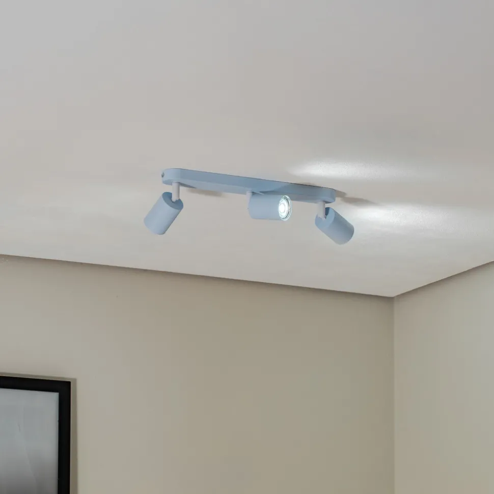 Downlight Livia imponerer med sitt elegante design i høykvalitets stål og plast, som skinner i en myk lyseblå farge. Med en bredde på 52 cm og tre individuelt justerbare spotlights tilbyr den en fleksibel belysningsløsning som er ideell for barnerommet. Bruken av GU10-pærer muliggjør målrettet belysning som er både funksjonell og estetisk tiltalende.