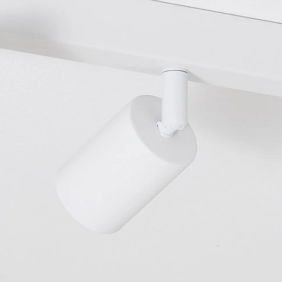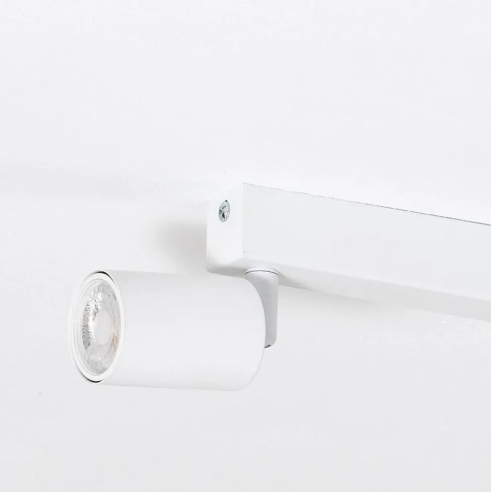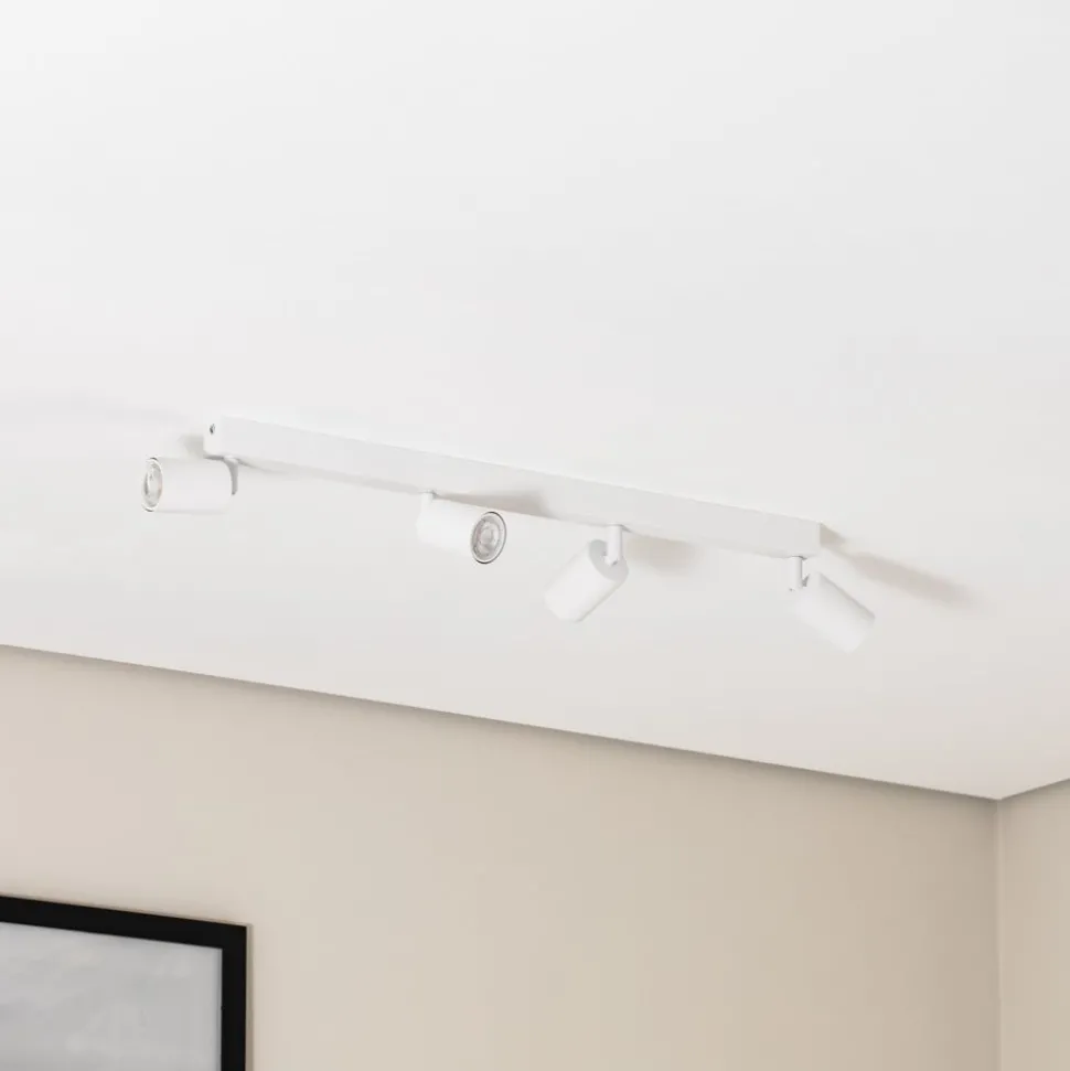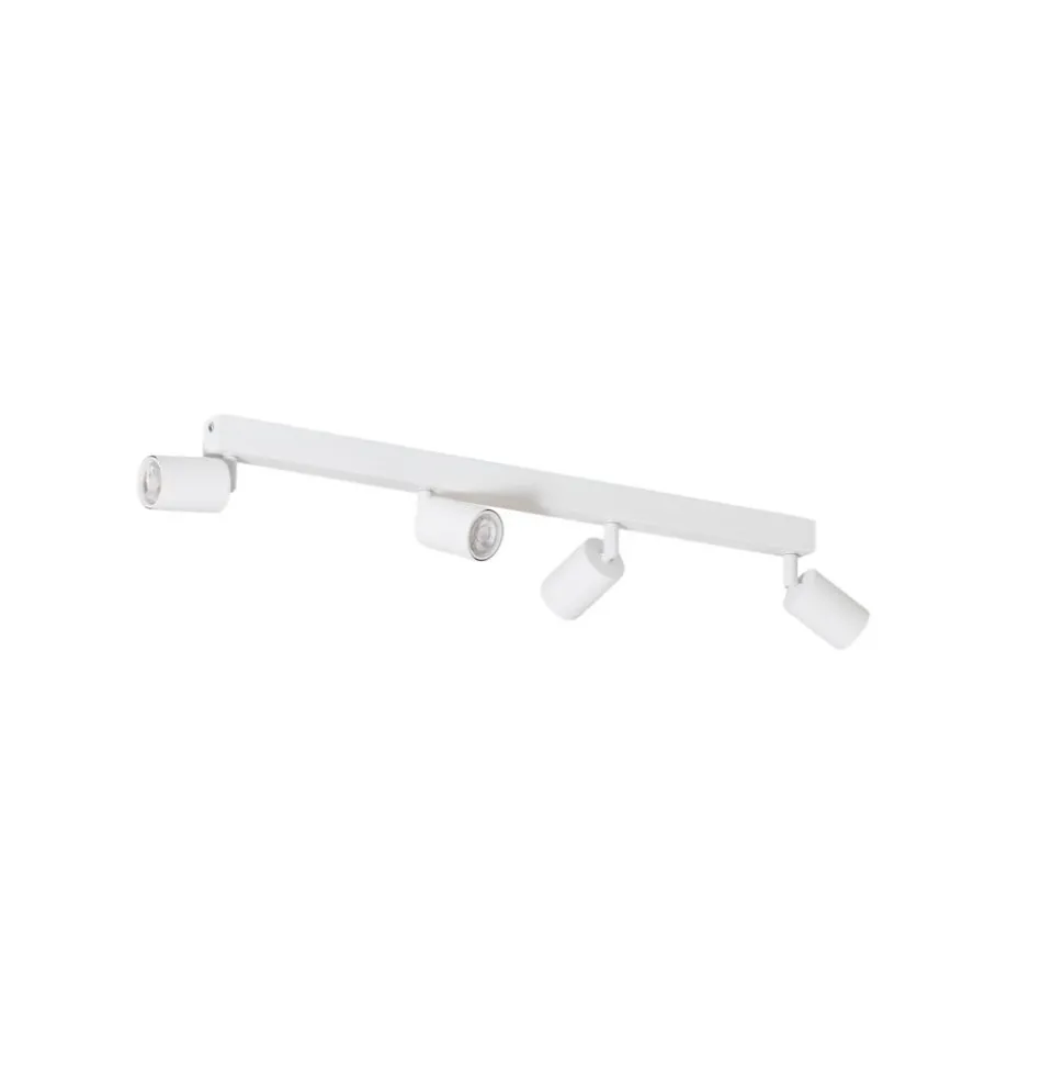GU10-downlight Top i stål med hvit finish består av en lang baldakin og fire sylindriske spotterhoder plassert på rad. Spotterhodene er justerbare, slik at lyset kan rettes mot ønsket område.