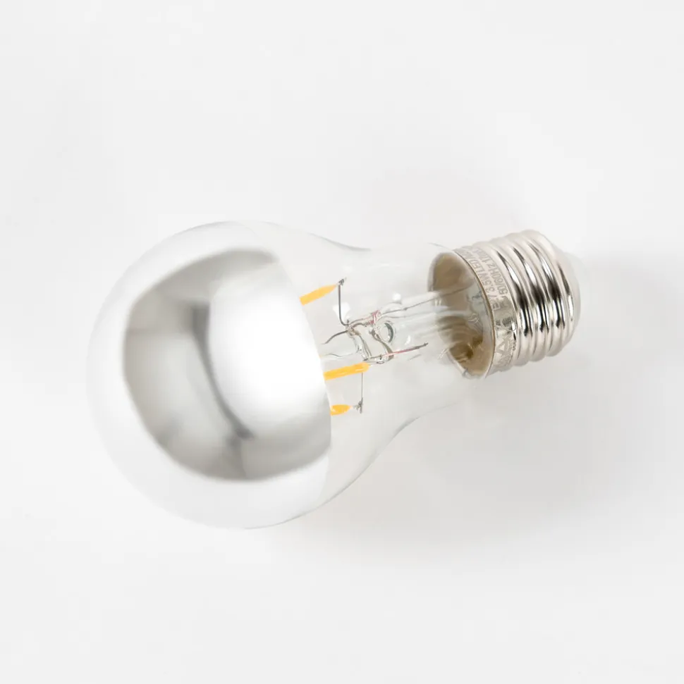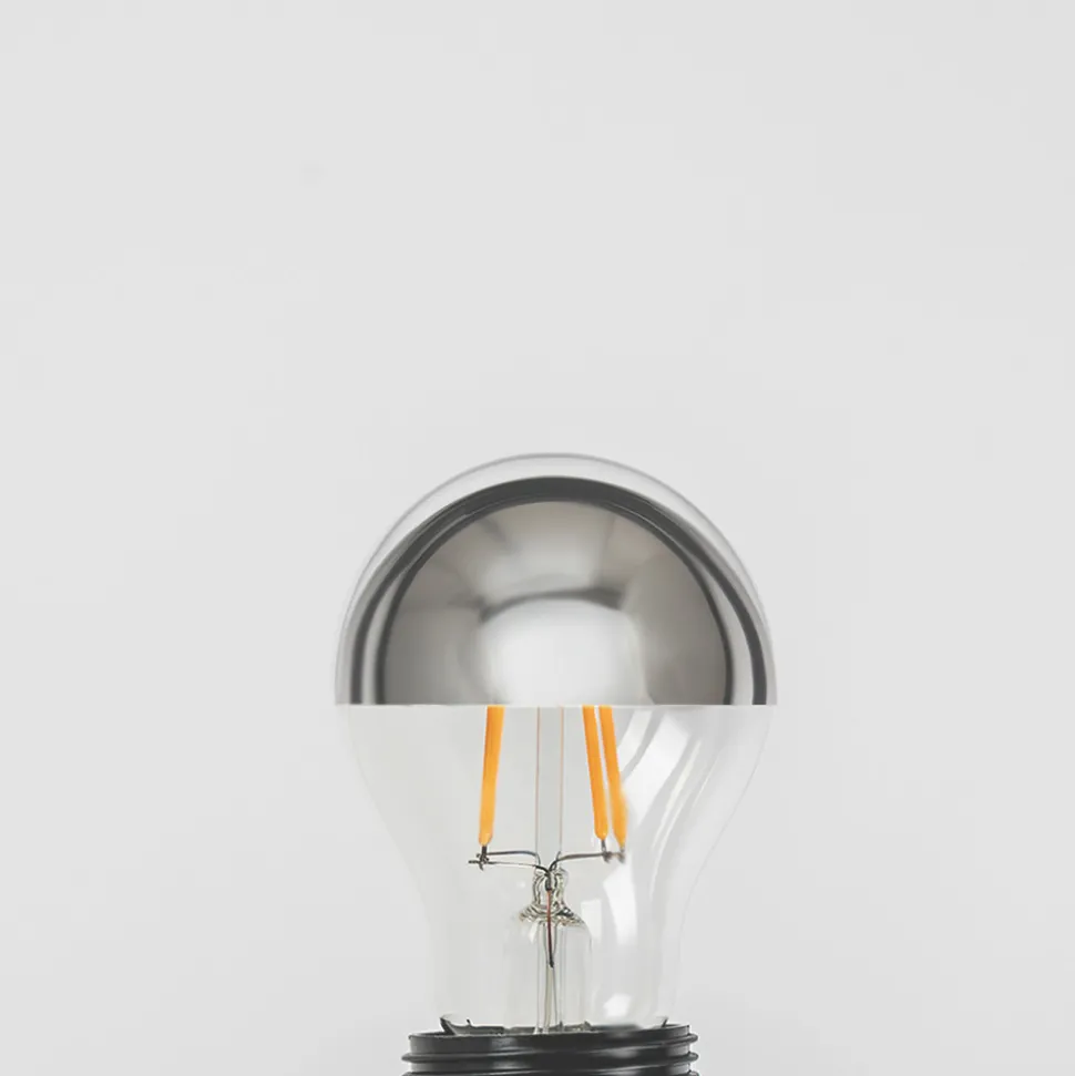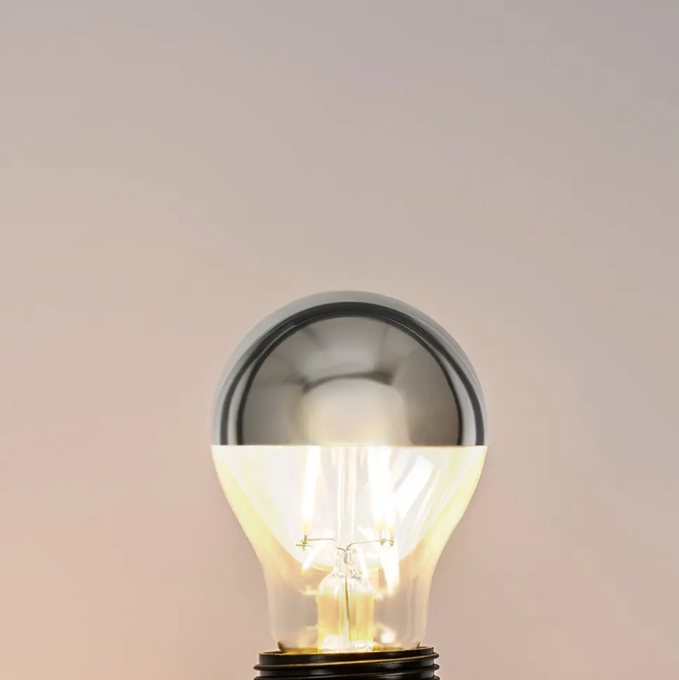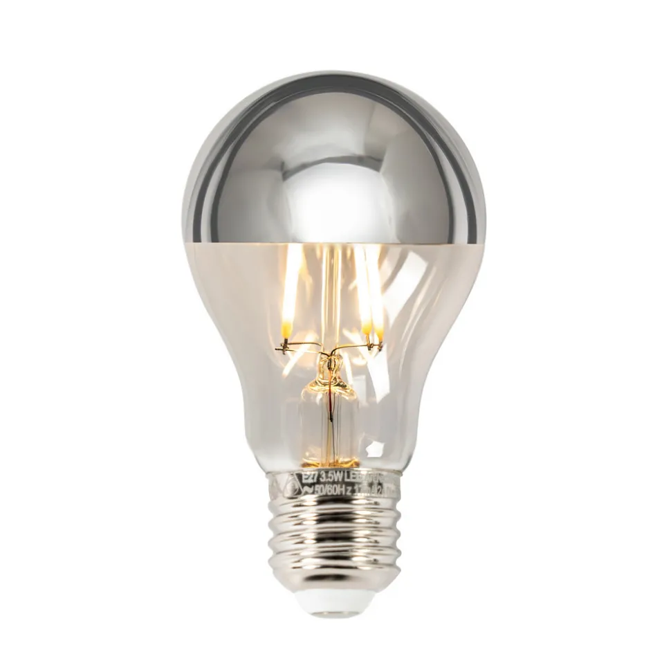 E27 toppforspeilet lyspære i glødelampelook med sølvbelegg, 3,5 W, svært god fargegjengivelse Dette toppforspeilet lyspære er ideelt for åpne armaturer, der den gir et nedtonet lys takket være den sølvfargede speildelen i den øvre delen. Pæren gir en varmhvit og dermed behagelig lysfarge, og kan dimmes ved behov. Den høye CRI-verdien på over 90 sikrer også en spesielt god fargegjengivelse. Tekniske data – 2 700 K – CRI > 90 – dimbar – sølvreflektor, ideell for åpne armaturer