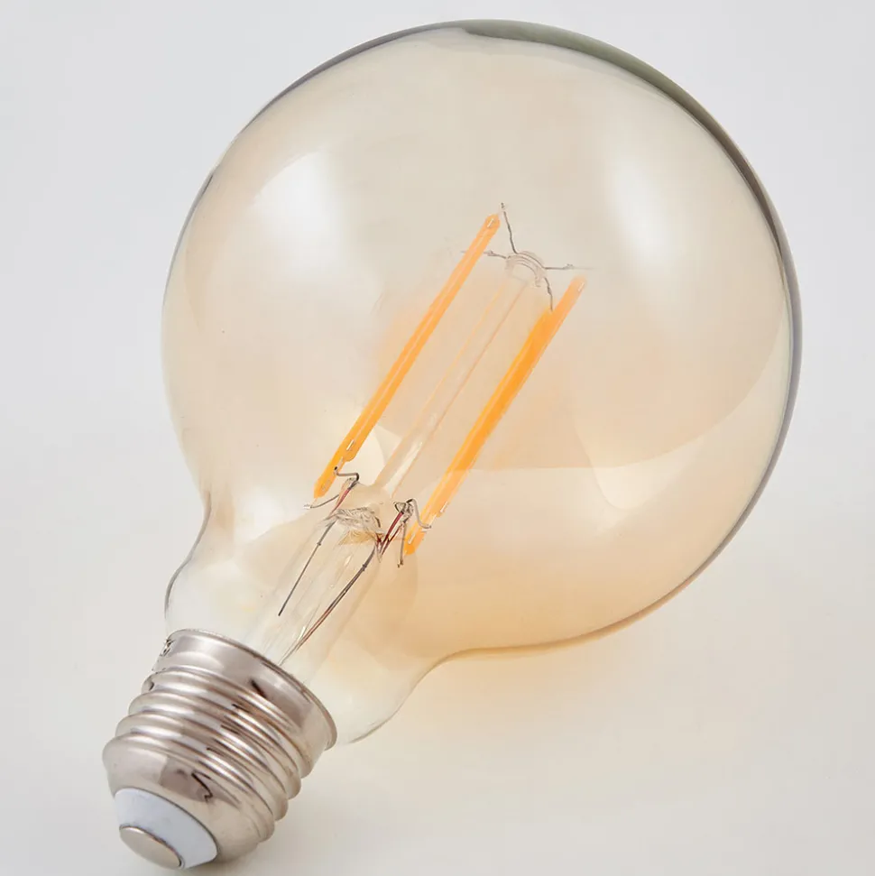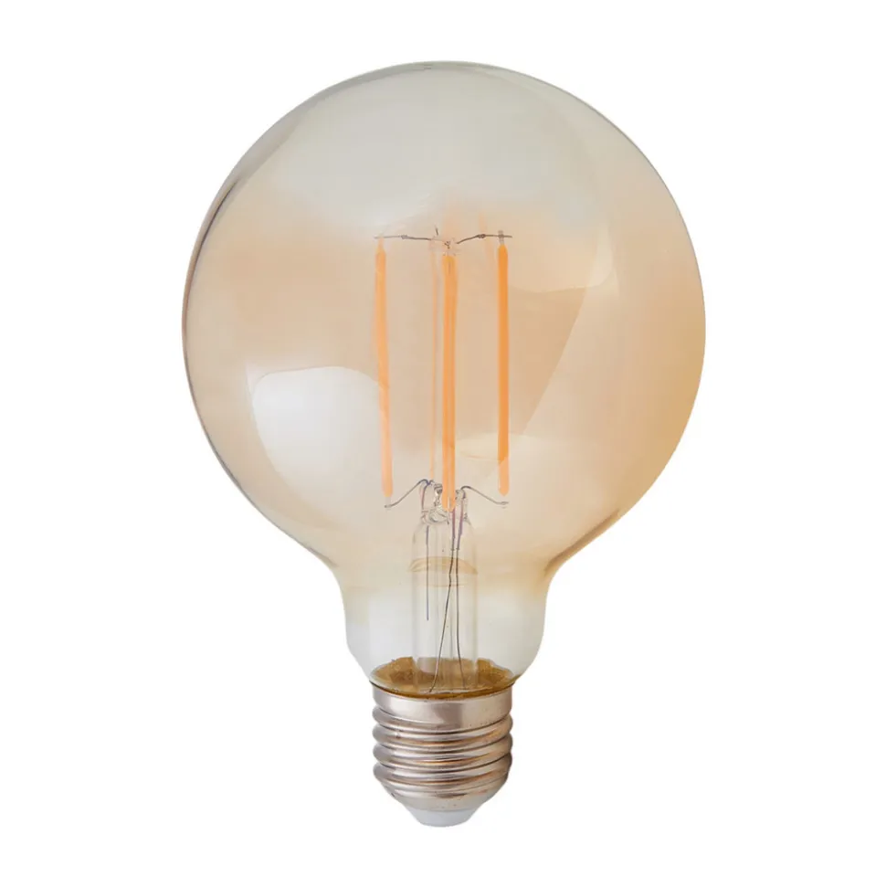 E27 LED globepære med glødetrådsteknologi i dekorativ rav Denne LED globepæren med ravfarget glass har en svært dekorativ effekt når den vris inn i brede, åpne hengelamper. LED-pærene med glødetrådsteknologi gir en koselig belysning med en svært varm lysfarge (1 800 K), noe som gjør pæren spesielt egnet for bruk i stuer eller soverom. Egenskaper: – Sammenligningsverdi 42 W (tradisjonell glødepære) – Strålevinkel 320° – Ikke dimbar