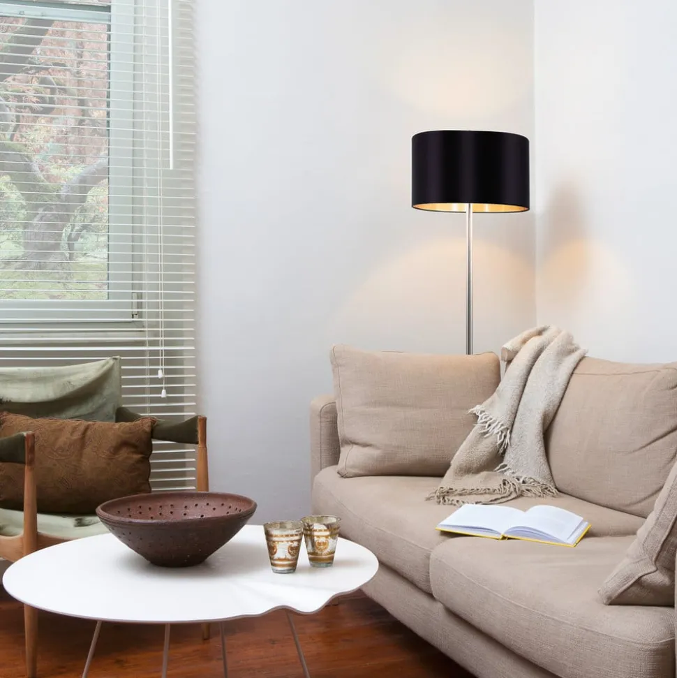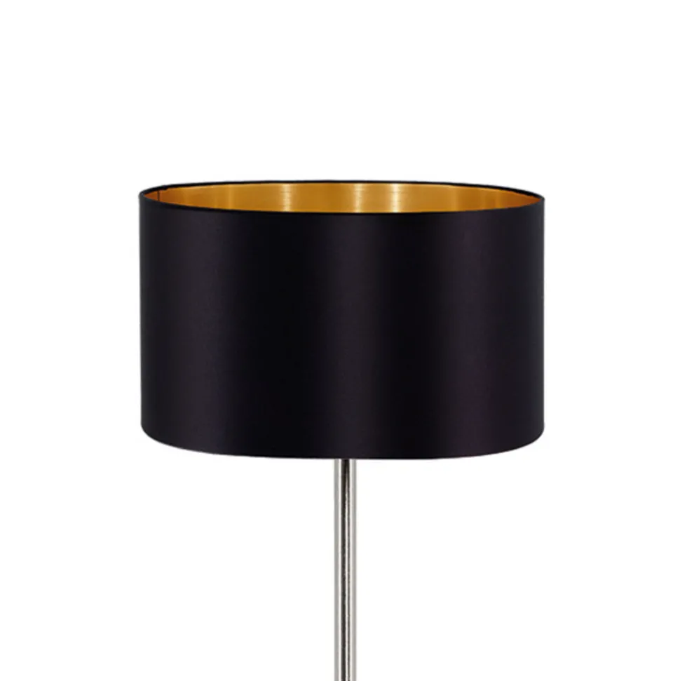 Maserlo er en elegant gulvlampe, som kan kombineres med de fleste innredningsstiler. Den består av en fin lampefot i matt nikkel og en svart tekstilskjerm med gullfarget innside. Den gylne innsiden, gir ikke lampen bare et elegant design, men skaper med dette også et ekstra varmt og nydelig lys, når lyset reflekteres i den gylne overflaten. En praktisk fotbryter på ledningen sørger for at lampen kan slås av og på komfortabelt.