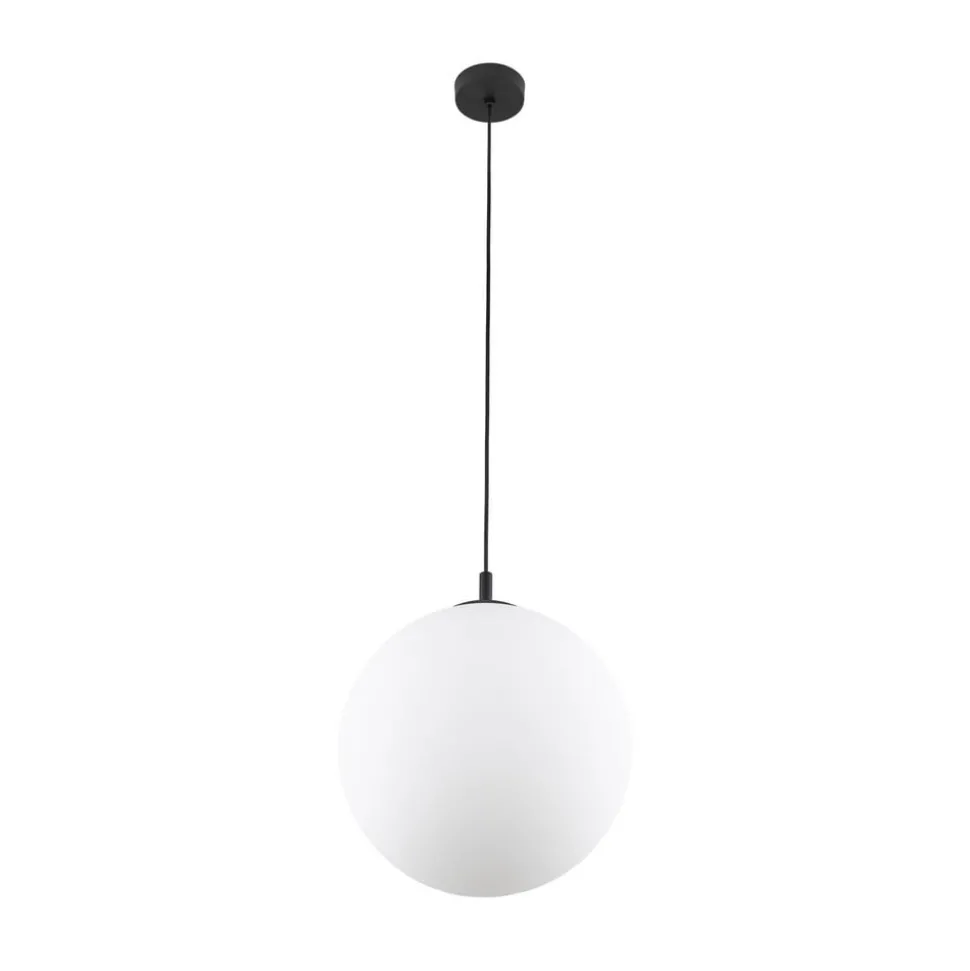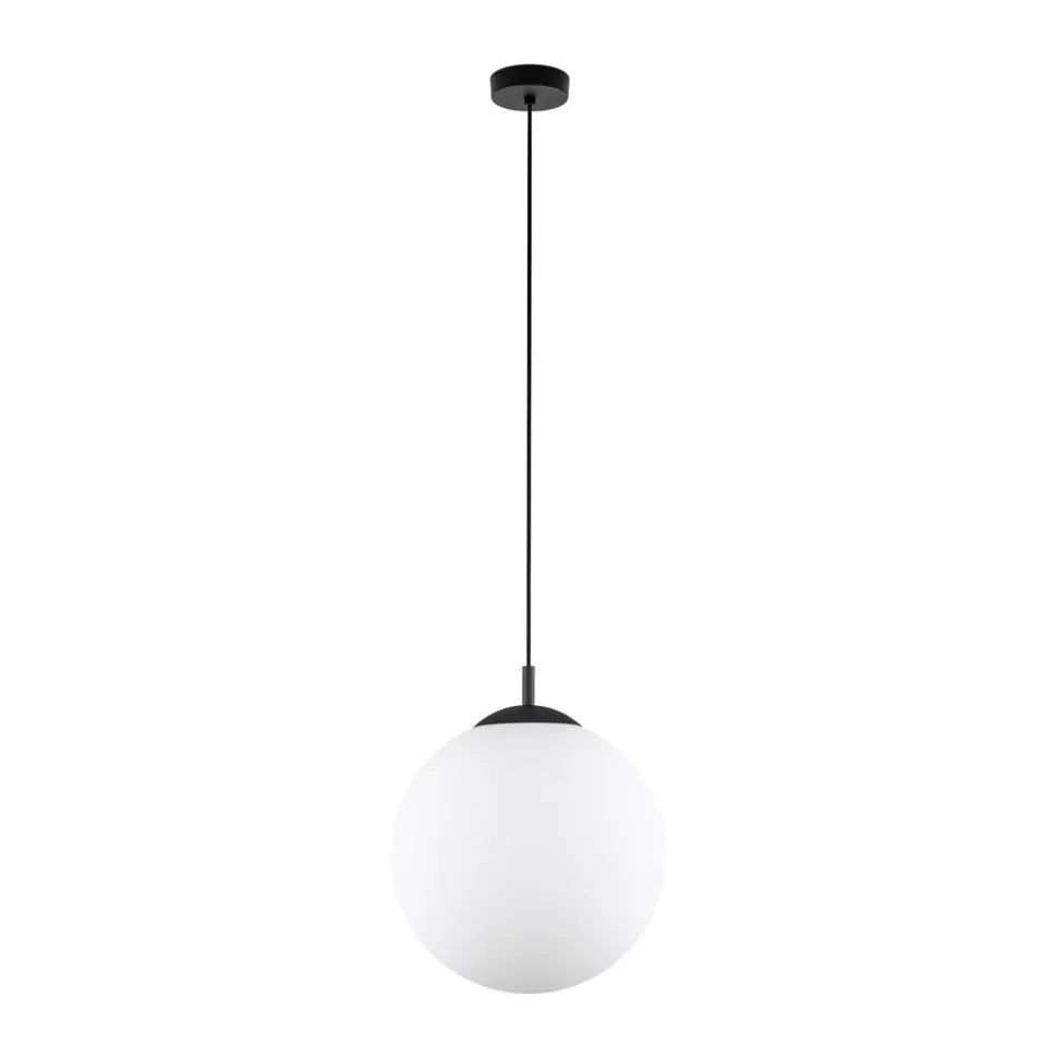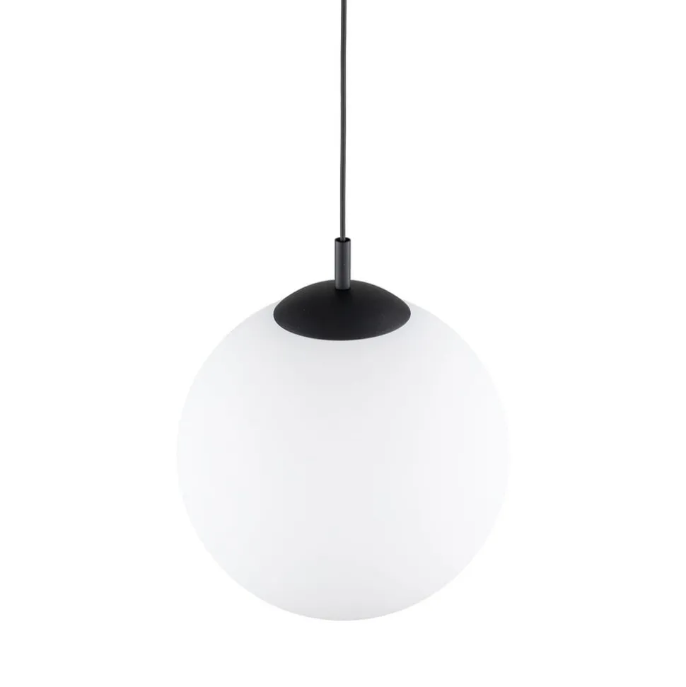 Esme glasspendel med opal sfærisk skjerm Esme-pendelen er tiltalende med sin sfæriske skjerm i opalt glass som sprer lyset fra lyskilden homogent. Feste, kabel og baldakin er utført i svart.