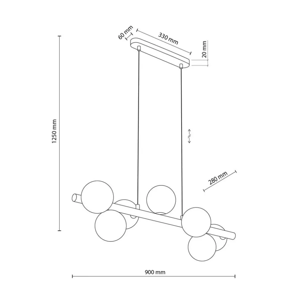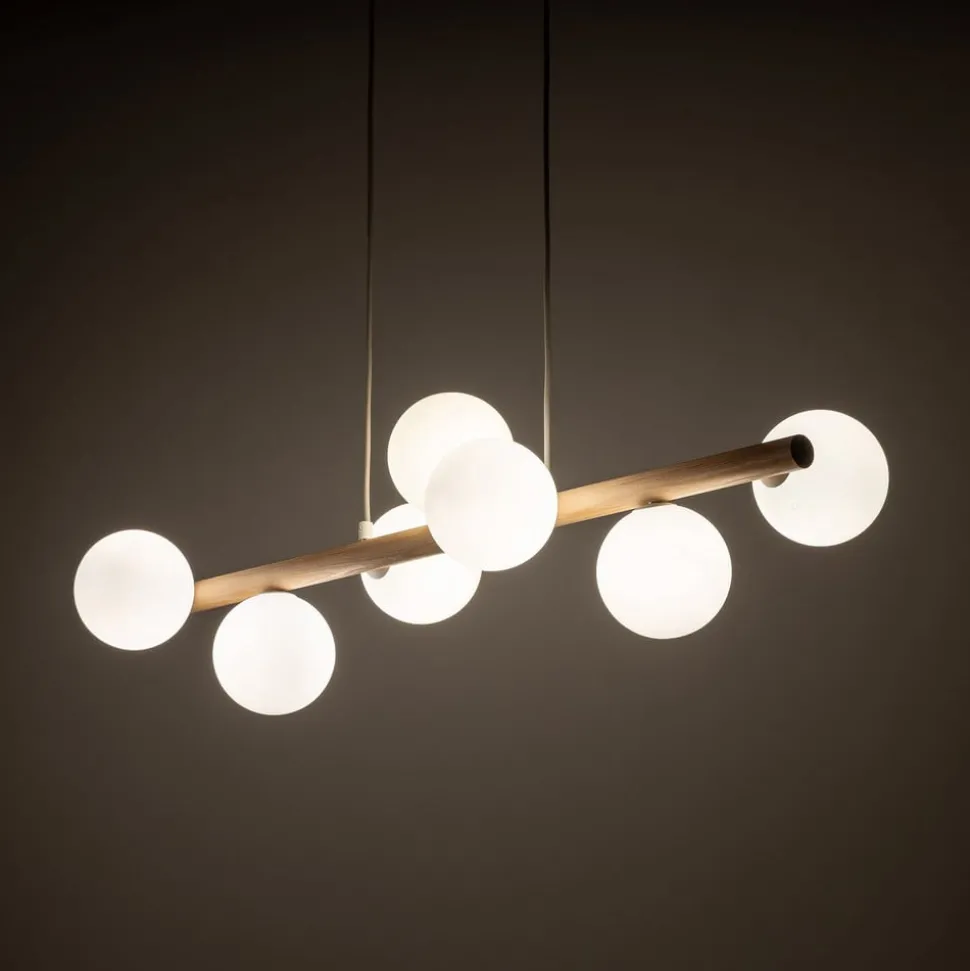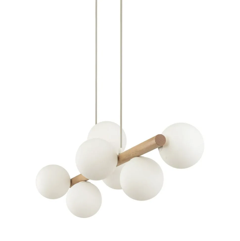 Estera pendellampe med trebjelke og syv kuleformede skjermer i opalt glass Med sine syv kuleformede skjermer i opalt glass, som hver har en G9 fatning, gir Estera pendellampe en behagelig belysning på alle sider. Den har også en bjelke i lyst tre og en baldakin i hvit metall.