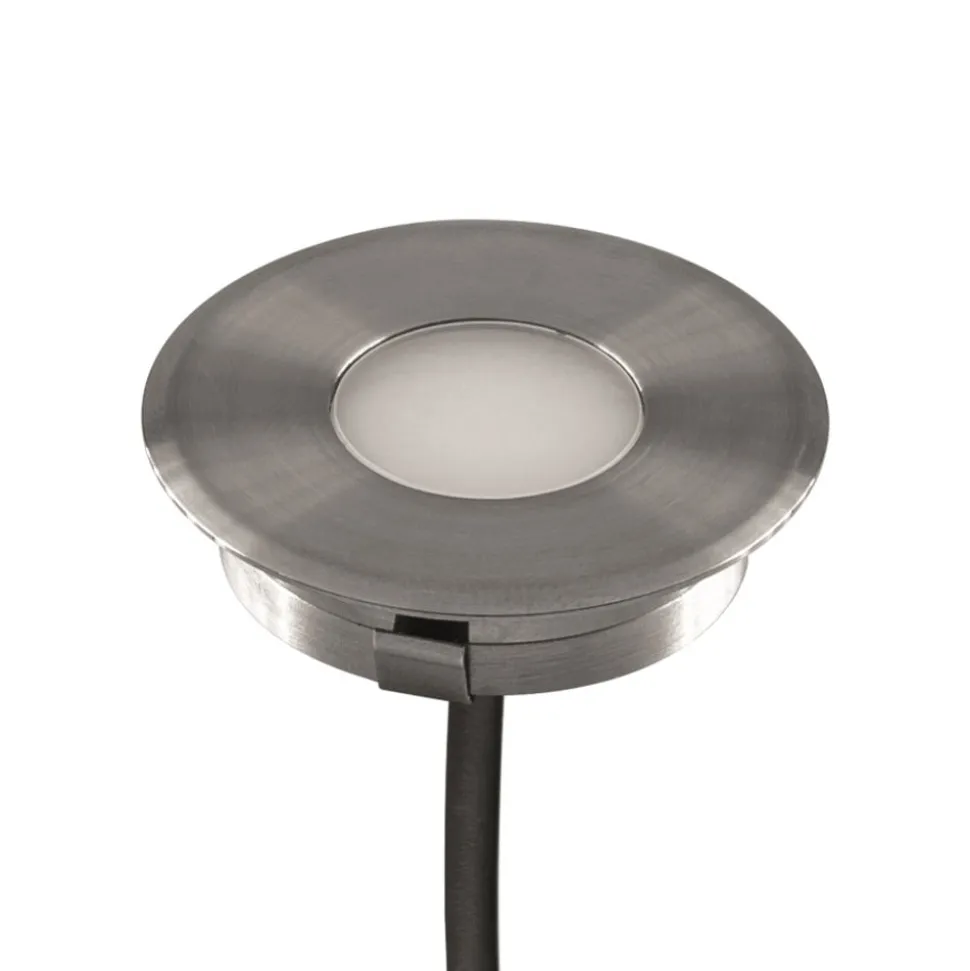Rund LED-bakkespot L6710 i rustfritt V4A-stål, blendingsfri, 12V/DC, IP67 LED-bakkespot L6710 gir blendingsfri, dekorativ belysning takket være et deksel av opalhvitt glass som passer inn i det rustfrie huset i rustfritt V4A-stål. Armaturen leveres med åpne ledningsender og en tre meter lang kabel for tilkobling til en egnet driver (se tilbehør). L6710 kan brukes utendørs takket være den høye kapslingsgraden. Den er selvfølgelig like godt egnet for innendørs bruk. Den innebygde LED-brikken genererer lys som sendes ut i en svært bred strålevinkel, og gir dermed belysning over et stort område. Tekniske funksjoner/egenskaper – Blendingsfri belysning – Rustfritt V4A rustfritt stål – Lysfordeling: symmetrisk – Ekstremt bredt spotlight: 120° – Maks. belastning 150 kg – IP-beskyttelsesgrad Kapslingsgrad IP67: beskyttet mot midlertidig nedsenking opp til 1,5 m dybde – Spenning: 12 V (AC/DC) – 3 m lang tilkoblingskabel med frie ledningsender Merk: En egnet driver er nødvendig for drift (se tilbehør).