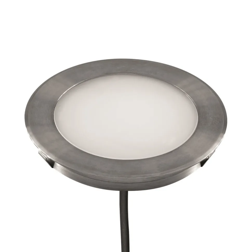 Rund LED-bakkespot L6710 i rustfritt V4A-stål, blendingsfri, 12V/DC, IP67 LED-bakkespot L6710 gir blendingsfri, dekorativ belysning takket være et deksel av opalhvitt glass som passer inn i det rustfrie huset i rustfritt V4A-stål. Armaturen leveres med åpne ledningsender og en tre meter lang kabel for tilkobling til en egnet driver (se tilbehør). L6710 kan brukes utendørs takket være den høye kapslingsgraden. Den er selvfølgelig like godt egnet for innendørs bruk. Den innebygde LED-brikken genererer lys som sendes ut i en svært bred strålevinkel, og gir dermed belysning over et stort område. Tekniske funksjoner/egenskaper – Blendingsfri belysning – Rustfritt V4A rustfritt stål – Lysfordeling: symmetrisk – Ekstremt bredt spotlight: 120° – Maks. belastning 150 kg – IP-beskyttelsesgrad Kapslingsgrad IP67: beskyttet mot midlertidig nedsenking opp til 1,5 m dybde – Spenning: 12 V (AC/DC) – 3 m lang tilkoblingskabel med frie ledningsender Merk: En egnet driver er nødvendig for drift (se tilbehør).