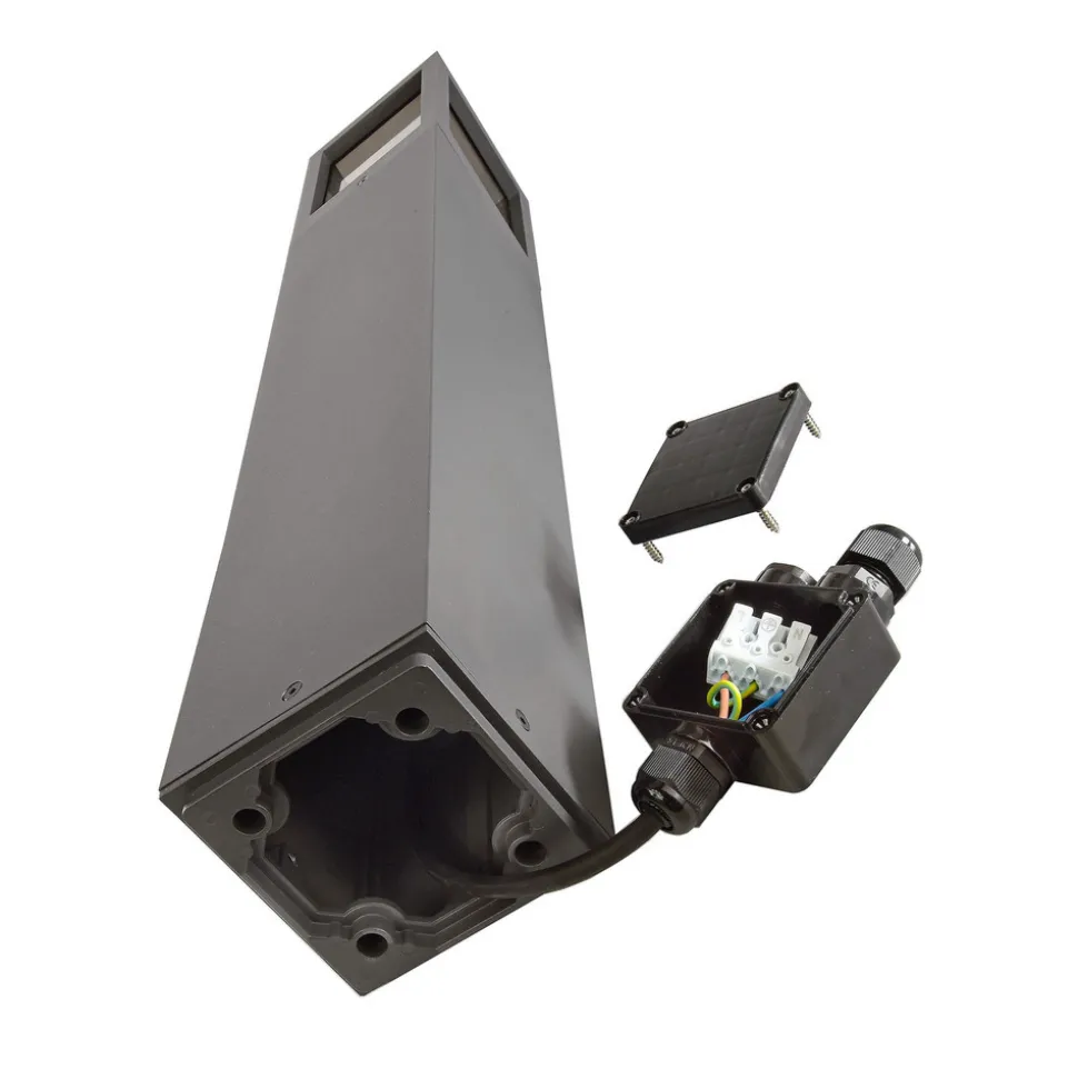 Facado II veilampe – den ideelle løsningen for utendørs gangveier Facado pullertlampe gir utmerket værbeskyttelse takket være kapslingsgrad IP 65. Den opale avtrekkeren gir et blendingsfritt og behagelig lys som sendes både sidelengs og oppover. Som et resultat gir det nydesignede lampehodet betydelig forbedret belysning. Armaturen er laget av høykvalitets trykkstøpt aluminium, er mørkegrå og har en kantet form. IP67-tilkoblingsboksen har en dobbel M20-kabelgjennomføring, som er egnet for jordkabler med blant annet 3×1,5 mm², 5×1,5 mm² eller 3×2,5 mm² – ideell for blant annet ST64-pærer og A60/70-pærer