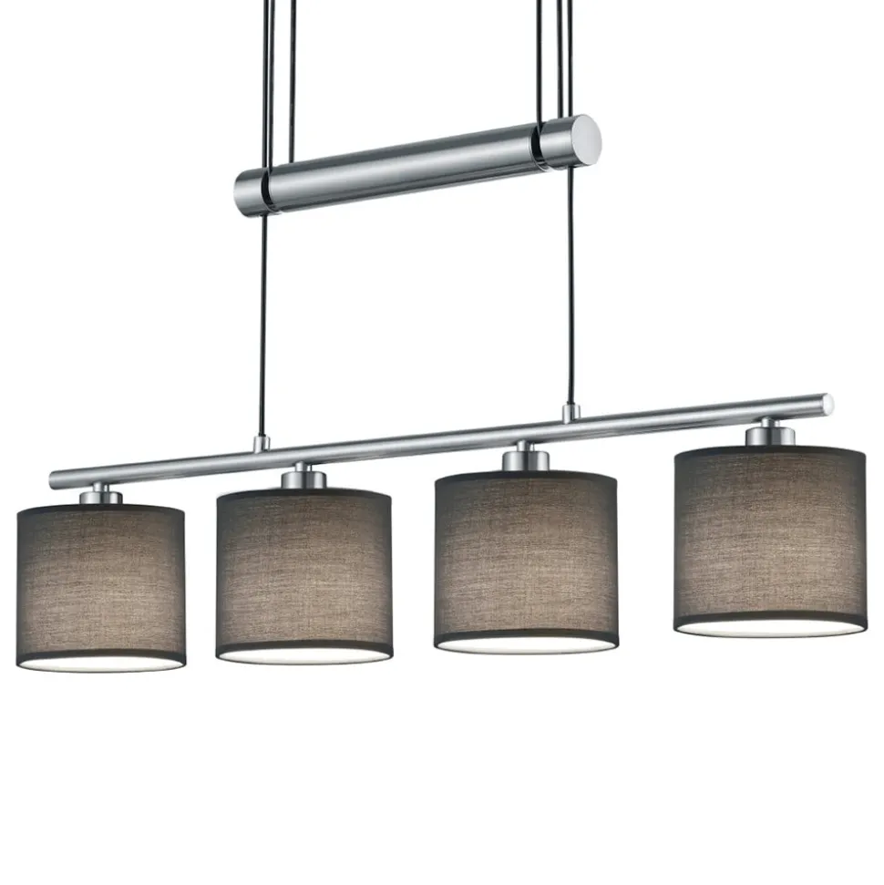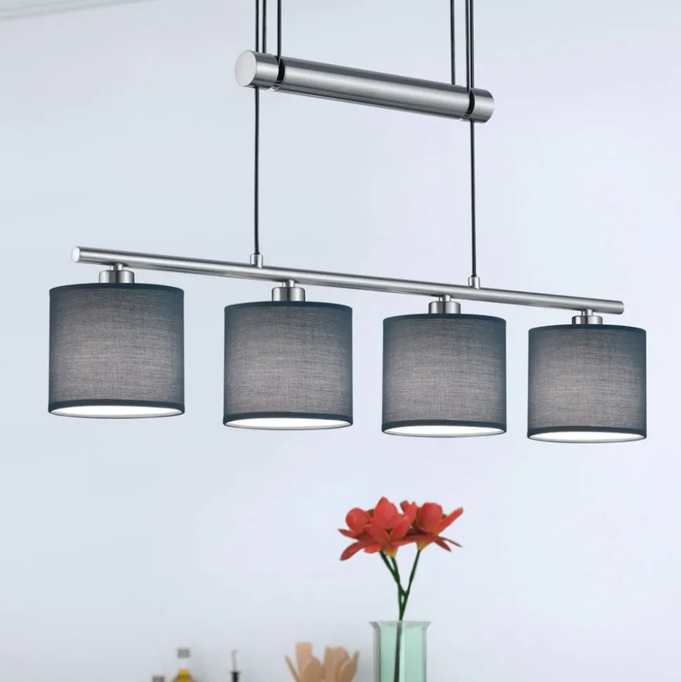 Garda 4 lyskilder pendellampe – høydejusterbar opp til 150 cm Garda 4 lyskilder pendellampe er ideell som bordbelysning i en moderne spisestue eller stue: Fire grå stoffskjermer er spredt over en lengde på 77 cm, og gir direkte nedadrettet lys for en homogen lysfordeling. Lyset trenger også forsiktig gjennom stoffet hele veien rundt, noe som skaper en veldig koselig atmosfære. Høyden på Garda hengelampe kan justeres til ønsket høyde mellom 90 cm og 150 cm ved hjelp av et håndtak.