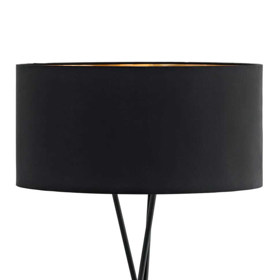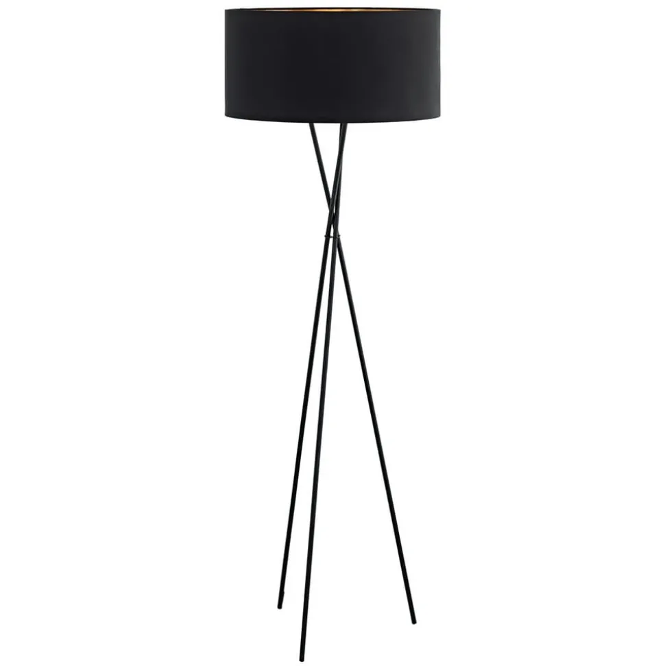 Stovlampen Fondachelli presenterer seg helt i sort med en lekker trebent ramme laget av stål og en sylindrisk, flat lampeskjerm av stoff. Innsiden av skyggen er farget i trendy kobber, som ikke bare resulterer i et elegant utseende, men også i en veldig fin lyseffekt. Gulvlampen er utstyrt med en fotbryter i tilførselsledningen for praktisk betjening og kan utstyres med alle typer E27-pærer (pære ikke inkludert).