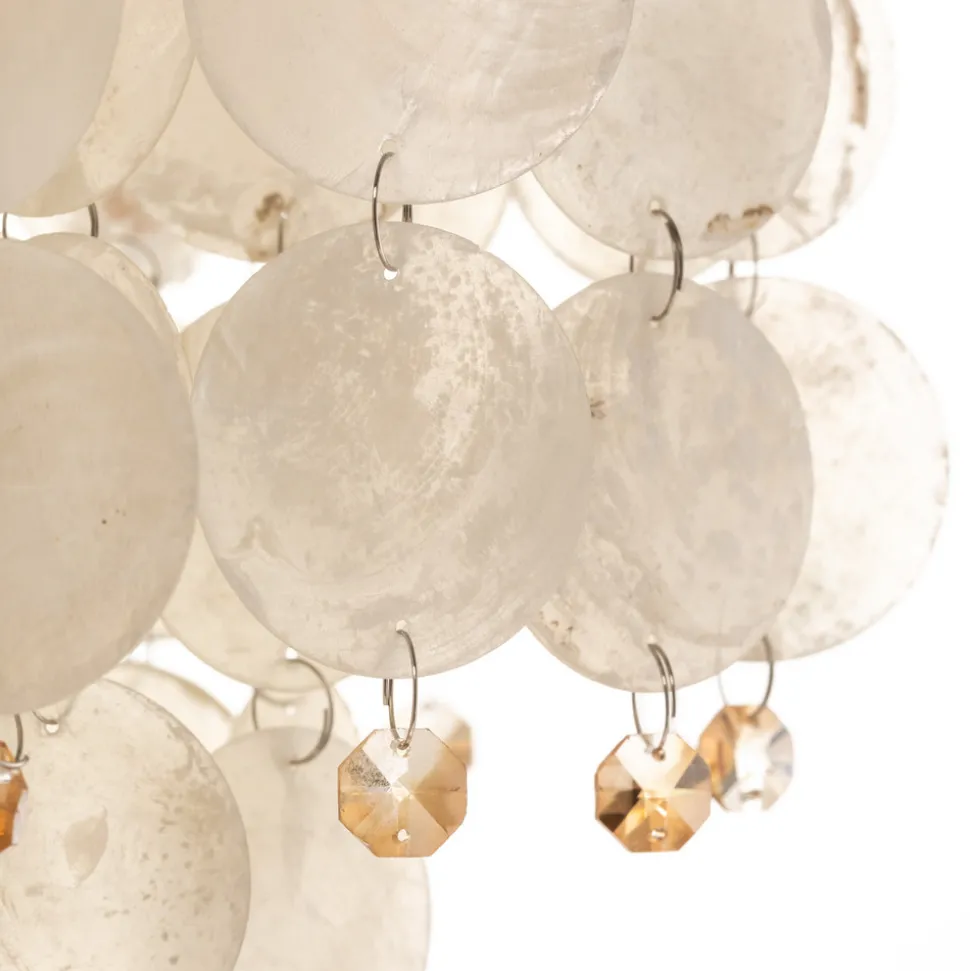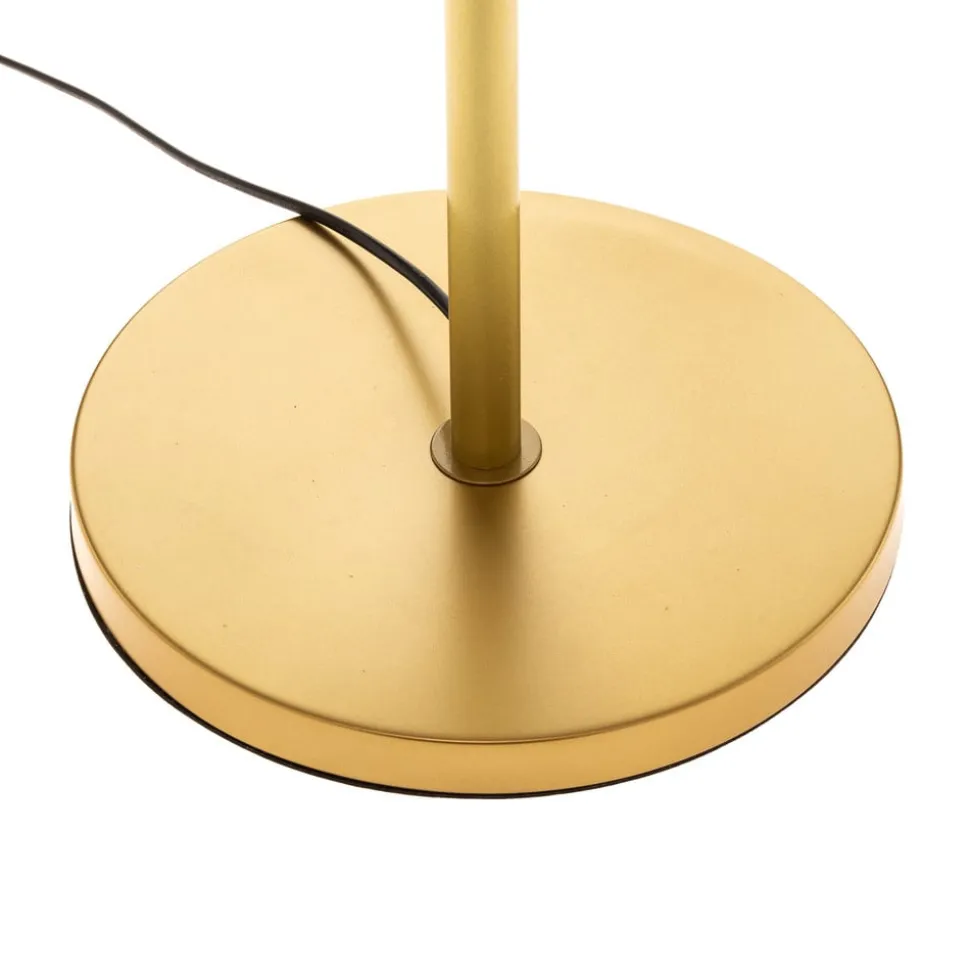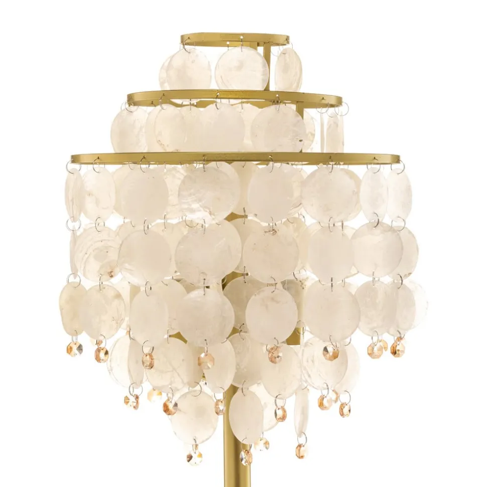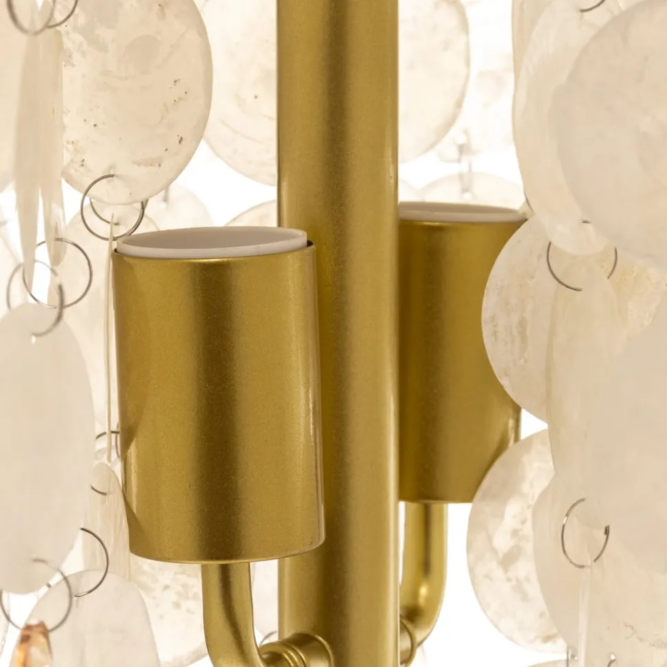 Gulvlampen Ruben med perlemorsskiver kombinerer edle materialer og stilig design. Den er laget av høykvalitets metall og dekorert med skinnende perlemorsskiver, og gir et luksuriøst preg til enhver stue eller spisestue. Den gyldne fargen harmonerer perfekt med de naturlige tonene i perlemoren og skaper en varm og innbydende atmosfære.
