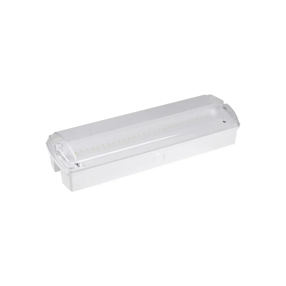 Hamm LED-rømningsveilampe fra Ledino for innfelt og utenpåliggende montering, IP65 Hamm LED-rømningsveilampe/nødlys er egnet for innfelt og utenpåliggende montering, og en passende monteringsramme er inkludert i leveransen, samt et utvalg av skilt (selvklebende folier). Et utskiftbart LiFePO-batteri på 3,7 V/1,5 Ah er også inkludert. Hamm lyser kun i nødlysmodus (>3 timer), men krever likevel kontinuerlig strømforsyning. Den er utstyrt med en standby-modus, og en permanent lysmodus kan stilles inn. Sikten er 24 m. Kan brukes som: – Nødlys for tak og vegg (utenpåliggende) – Rømningslys med selvklebende film (utenpåliggende) – Nødlys (takmontert) – Driftstid: 180 minutter – Slagfasthet IK06 – IP65 – Beskyttelse mot vannstråler