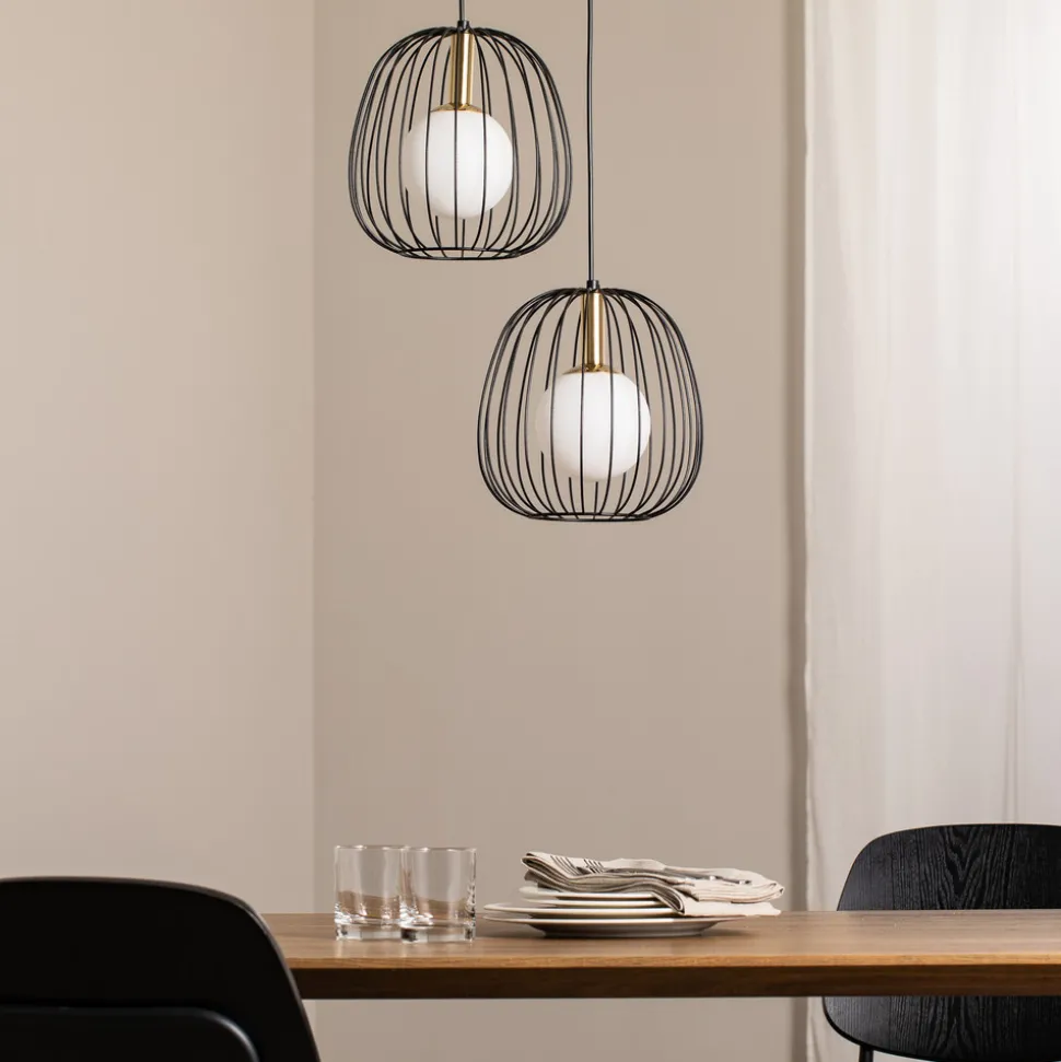 Hengelampen Bell, 2 lyskilder, kombinerer moderne design med høykvalitetsmaterialer som stål og glass. Den stilfulle fargekombinasjonen av svart, gull og hvitt setter et spesielt preg i enhver stue eller spisestue. Lampen er produsert i Europa og gjenspeiler dermed europeisk håndverk. Med sine 2 lyskilder sørger den for jevn og behagelig belysning som bader rommet i et harmonisk lys.