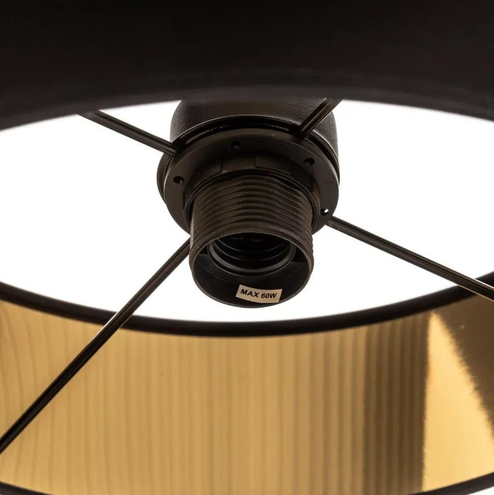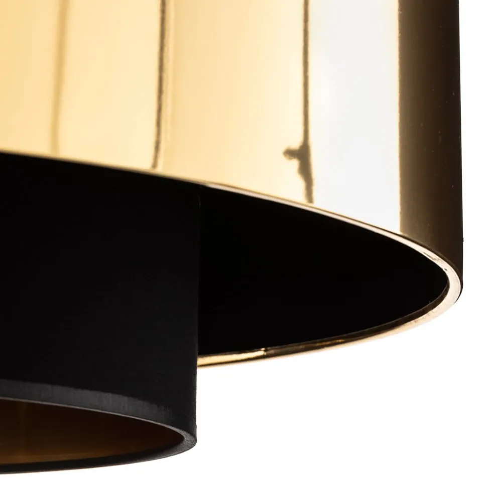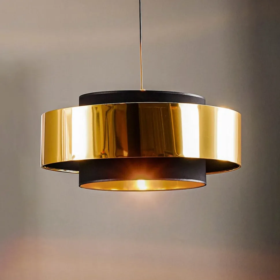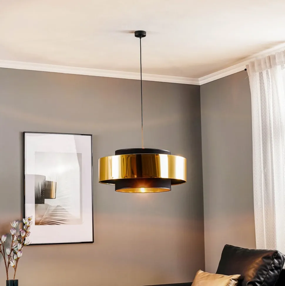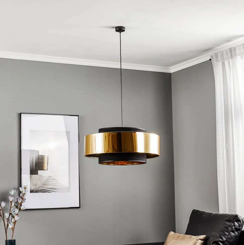 Hengelampen Calisto, 1 lyskilde, Ø 60 cm, kombinerer moderne design med høykvalitetsmaterialer som metall, plast og tekstil. Den stilfulle kombinasjonen av svart og gullfarge gir ethvert rom et elegant preg. Denne lampen er spesielt egnet for stuer og spisestuer og har en imponerende tilstedeværelse som både fungerer som sentralt belysningselement og dekorativt høydepunkt.