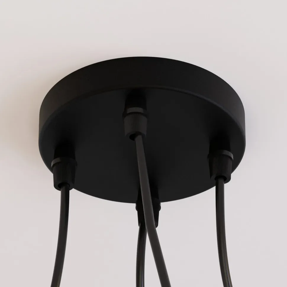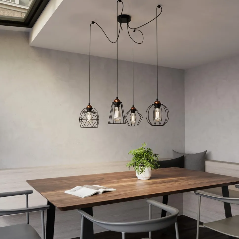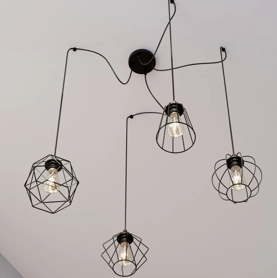 Hengelampen Galaxy med fire burskjermer kombinerer moderne design med funksjonell fleksibilitet. Denne lampen er laget av høykvalitets metall og plast og passer perfekt inn i moderne oppholdsrom som stuer, kjøkken eller spisestuer. Den desentraliserte opphenget gjør det mulig å skreddersy lampen, slik at den gir hvert rom et personlig preg.