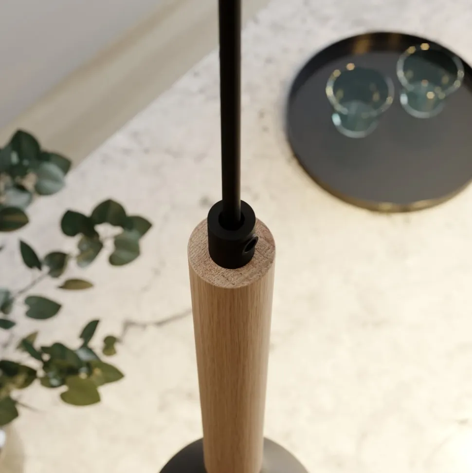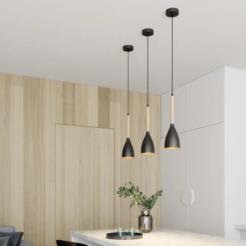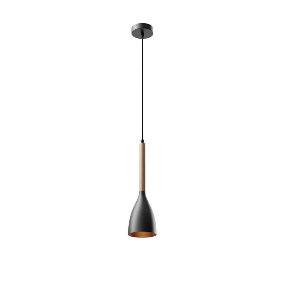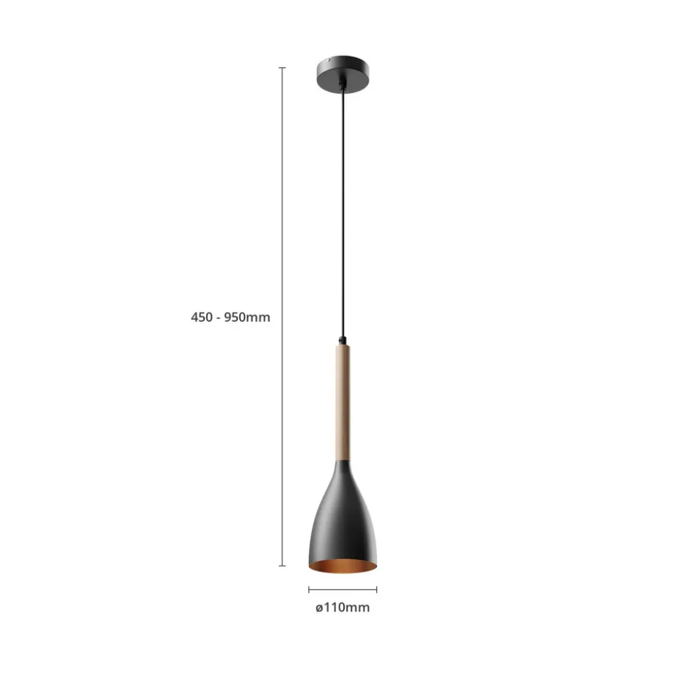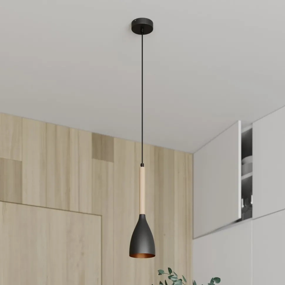 Hengelampen Muza kombinerer moderne design med en fascinerende materialkombinasjon av metall og lyst tre. Den stilige fargen i svart og gull gir ethvert rom, enten det er stue, kjøkken eller spisestue, et spesielt preg. Lampen imponerer med sitt klare formspråk og den harmoniske kombinasjonen av materialer, som både er visuelt og funksjonelt overbevisende.