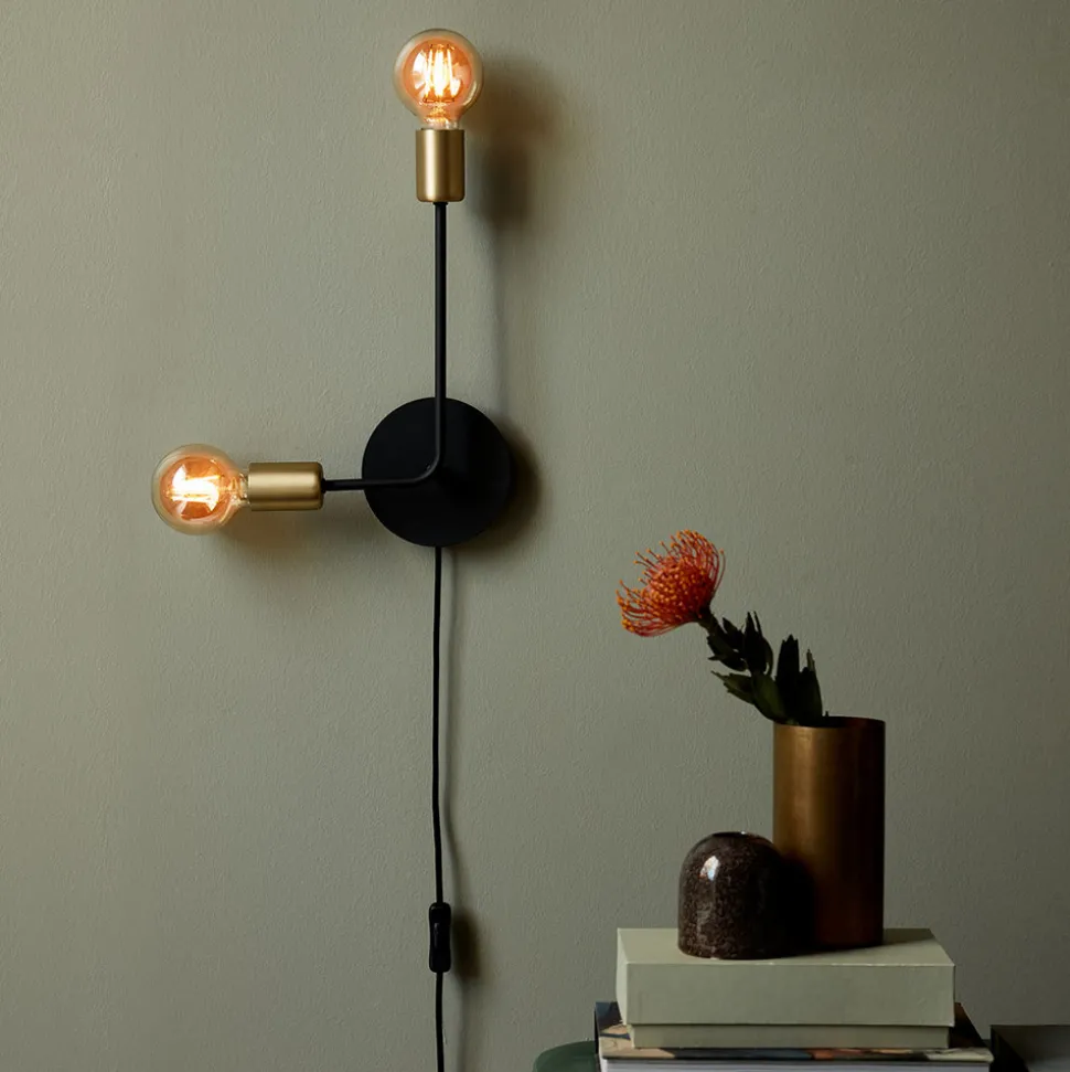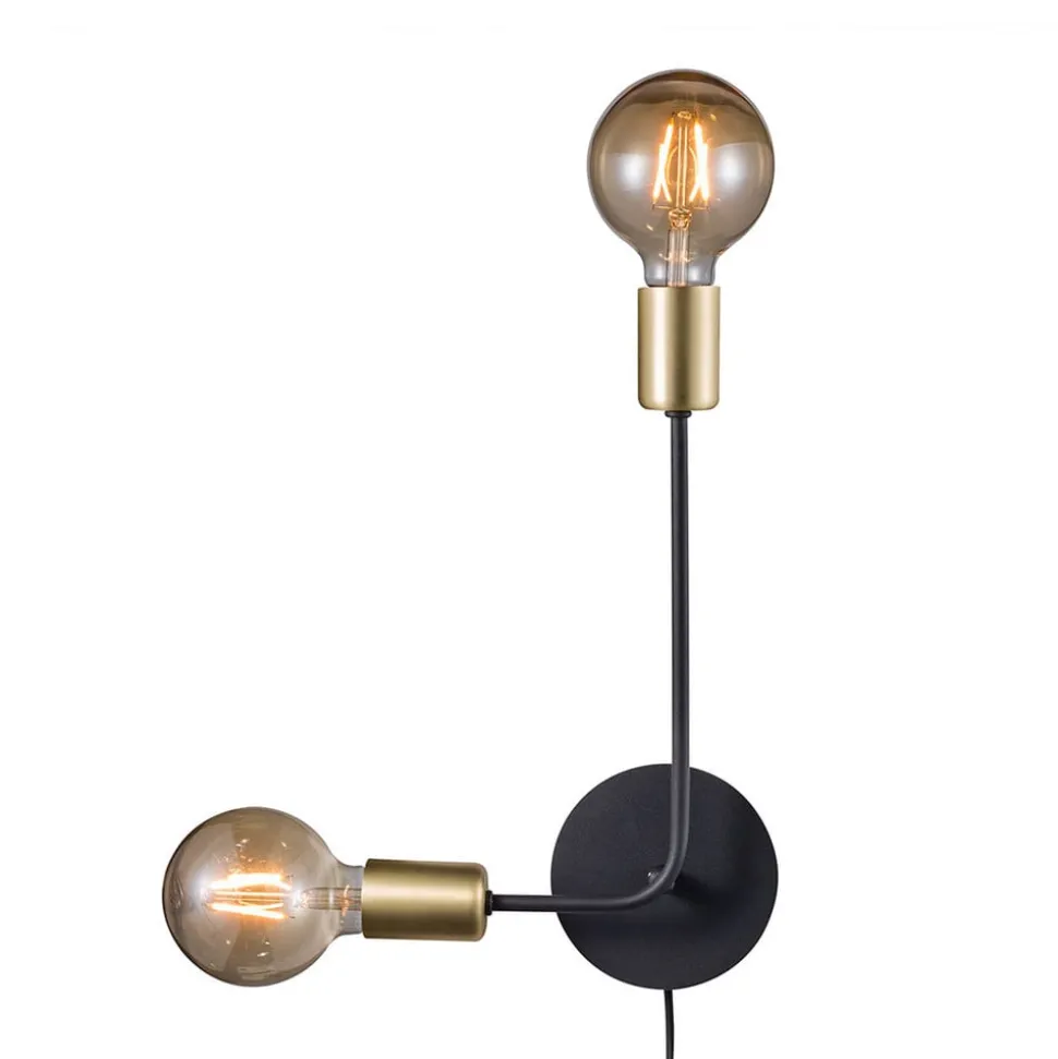 Svart vegglampe Josefine med messingdetaljer, kabel og plugg