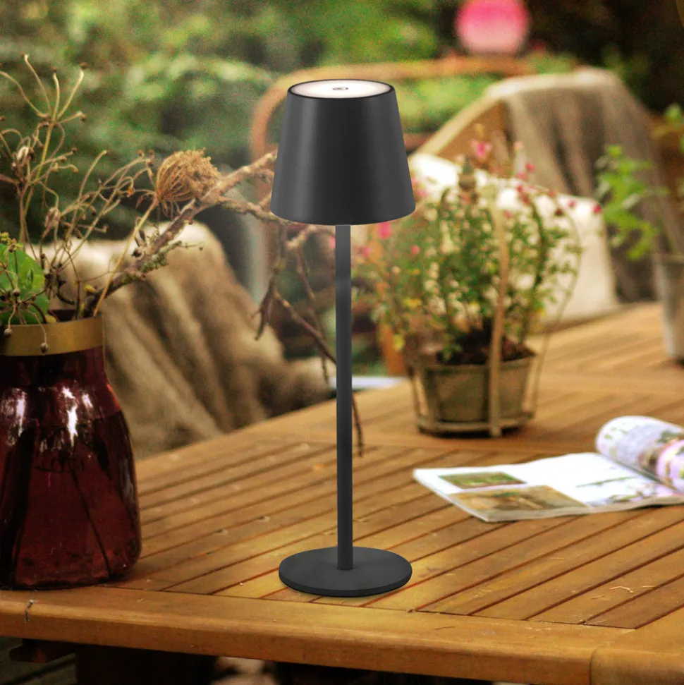 Euria mobil LED-bordlampe for innendørs og utendørs bruk – justerbar lysstyrke Euria er en klassisk formet bordlampe med rund fot og lampeskjerm i form av en kjegle. Sistnevnte huser den varmhvite LED-modulen, hvis lys sendes forsiktig oppover og nedover og kan kobles til og dimmes ved hjelp av en berøringsdimmer på toppen. Den sprutsikre designen og det oppladbare batteriet gjør Euria til en fleksibel ekstra lyskilde for stuer, uteplasser og hager – Rammen kan justeres i høyden under installasjonen – Kapslingsgrad: IP54 – Ladetid: 4 timer – Brenntid ved høy lysstyrke: 6 timer