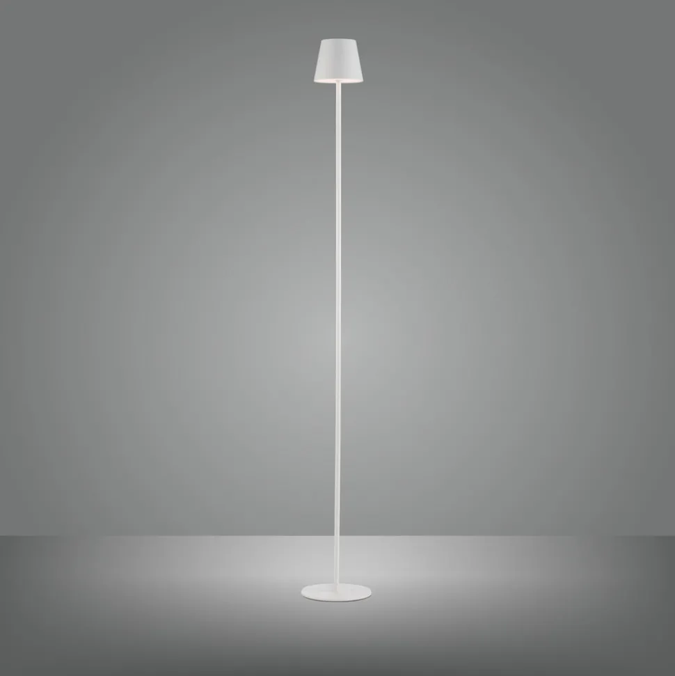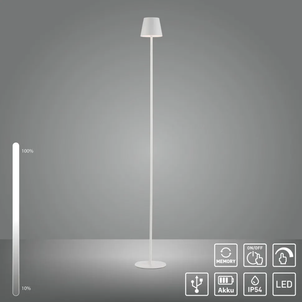 Euria mobil LED-gulvlampe for innendørs og utendørs bruk – justerbar lysstyrke Euria er en klassisk formet gulvlampe med rund fot, slank ramme og lampeskjerm med konisk form. Sistnevnte huser den varmhvite LED-modulen, hvis lys sendes forsiktig oppover og nedover og kan kobles til og dimmes ved hjelp av en berøringsdimmer på toppen. Den sprutsikre designen og det oppladbare batteriet gjør Euria til en fleksibel ekstra lyskilde for stue, uteplass og hage – Rammen kan justeres i høyden under installasjonen – Kapslingsgrad: IP54 – Ladetid: 4 timer – Brenntid ved høy lysstyrke: 6 timer