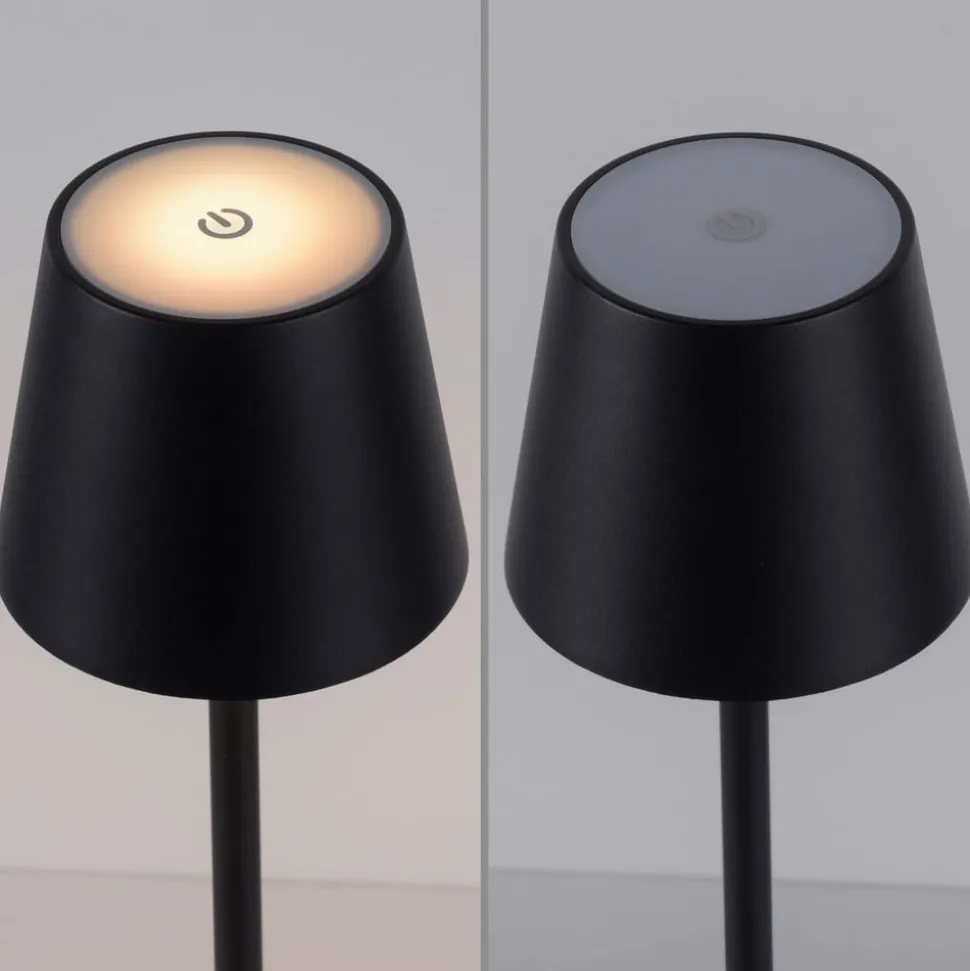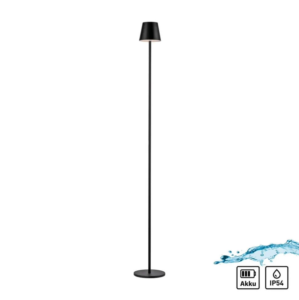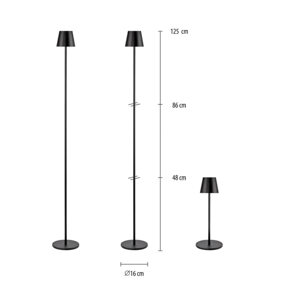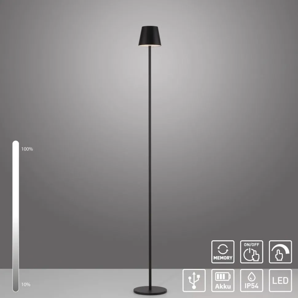 Euria mobil LED-gulvlampe for innendørs og utendørs bruk – justerbar lysstyrke Euria er en klassisk formet gulvlampe med rund fot, slank ramme og lampeskjerm med konisk form. Sistnevnte huser den varmhvite LED-modulen, hvis lys sendes forsiktig oppover og nedover og kan kobles til og dimmes ved hjelp av en berøringsdimmer på toppen. Den sprutsikre designen og det oppladbare batteriet gjør Euria til en fleksibel ekstra lyskilde for stue, uteplass og hage – Rammen kan justeres i høyden under installasjonen – Kapslingsgrad: IP54 – Ladetid: 4 timer – Brenntid ved høy lysstyrke: 6 timer