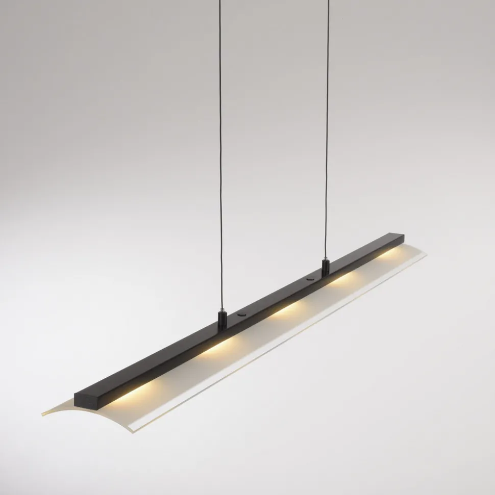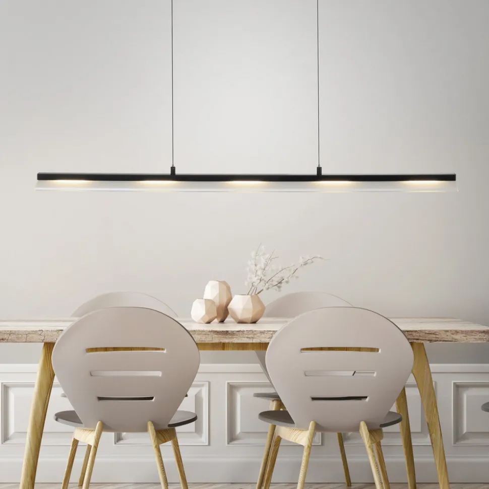 Nele LED-pendellampe, dimbar via veggbryter Den svarte Nele LED-pendellampen er perfekt til å lyse opp spisebordet eller kjøkkenøya. I armaturen er det installert en LED-tavle med varmhvit lysfarge, som avgir et effektivt nedadrettet lys gjennom de individuelle lysuttakene og det matte glassdekselet. Hengelampen med filigran opphengssystem kan dimmes via lysbryteren uten ekstra installasjonsarbeid. Lyset kan dimmes til enten full lysstyrke, 50 % lysstyrke eller 12 % lysstyrke. Valget gjøres ved å trykke flere ganger på lysbryteren.