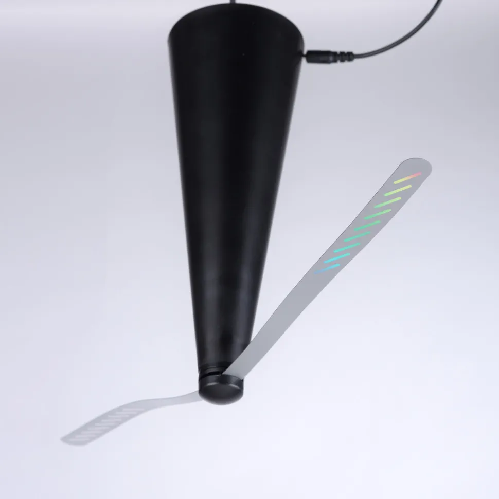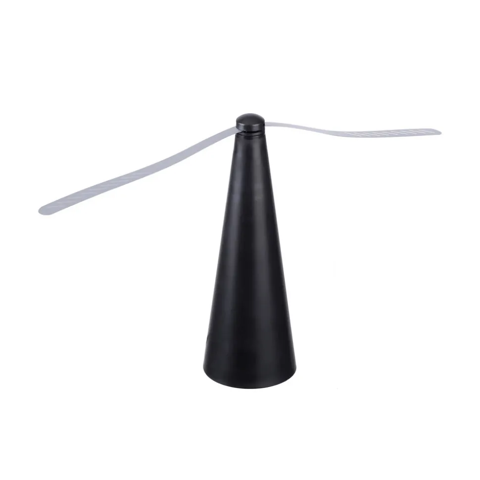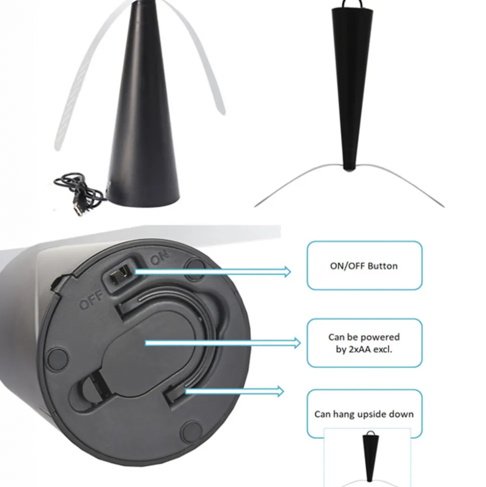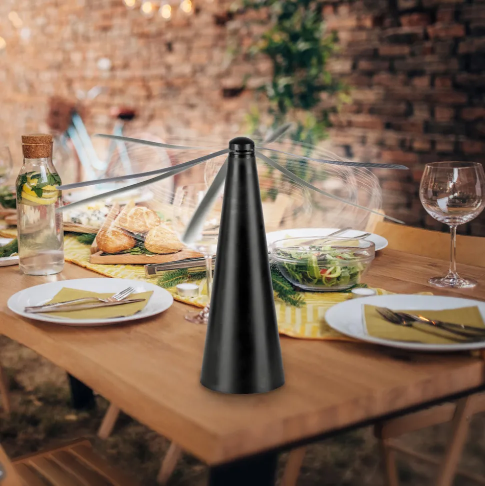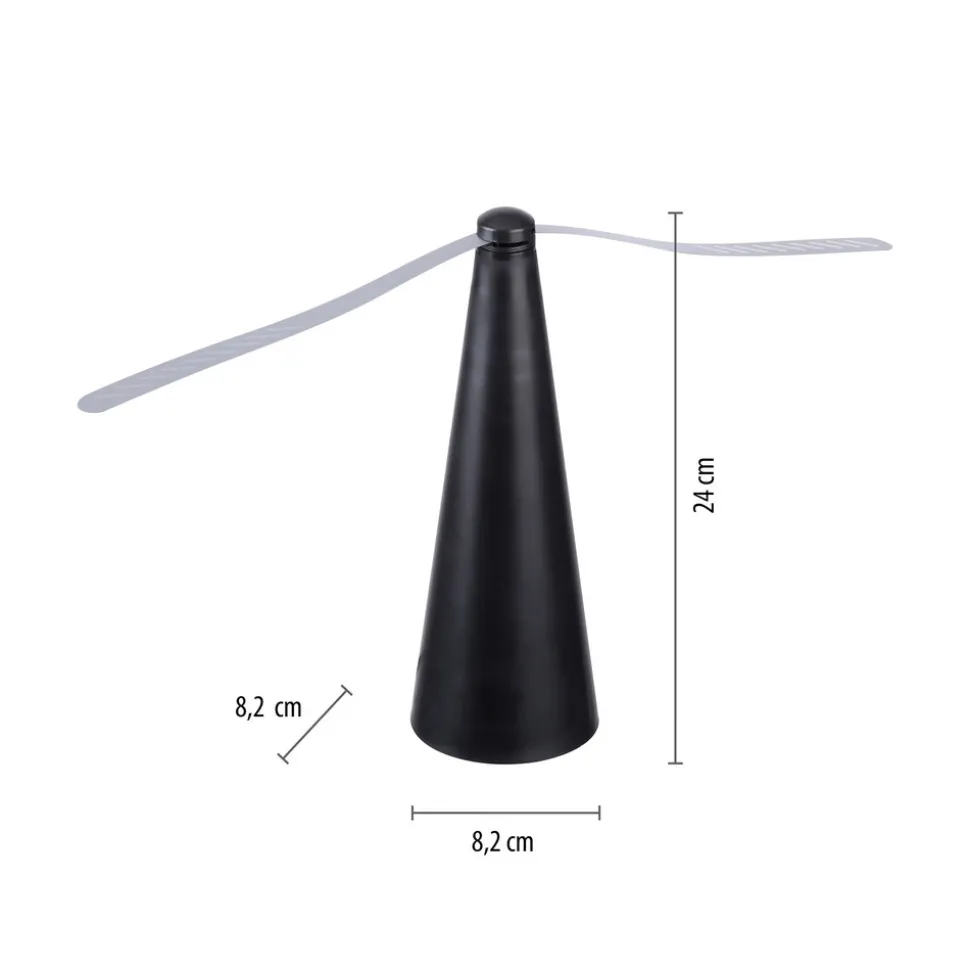 For avvisning av insekter: Swat fluesmekker til terrassen Hvis du vil sitte komfortabelt på terrassen mens du spiser og ikke vil bli plaget av insekter, kan du bruke Swat fluesmekker, som setter luften i bevegelse takket være de roterende propellstrimlene, og dermed jager bort insekter, veps og fluer og holder dem borte fra maten din. Flueavviseren kan plasseres på bordet eller henges opp. Strømforsyningen fungerer via USB-kabel, eventuelt også med to AA-batterier (medfølger ikke).