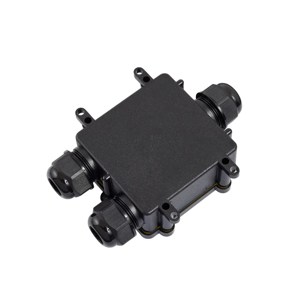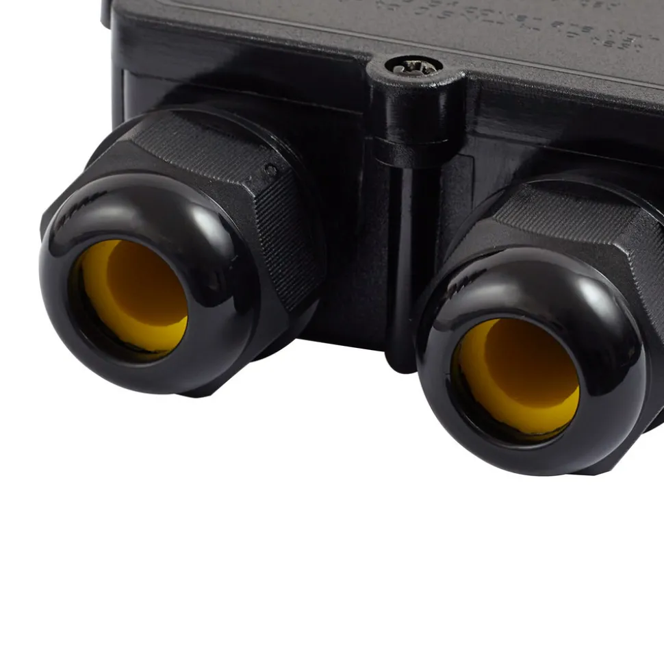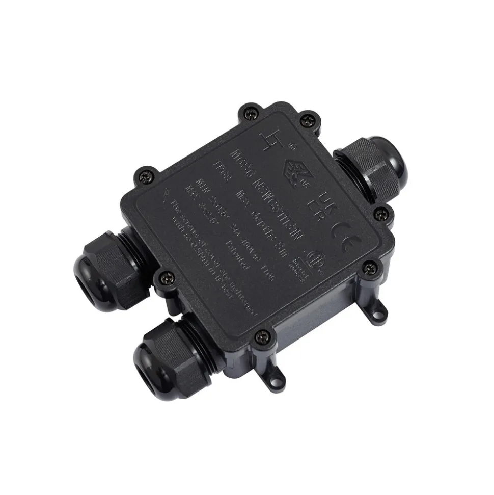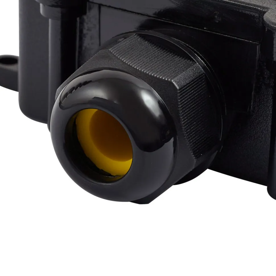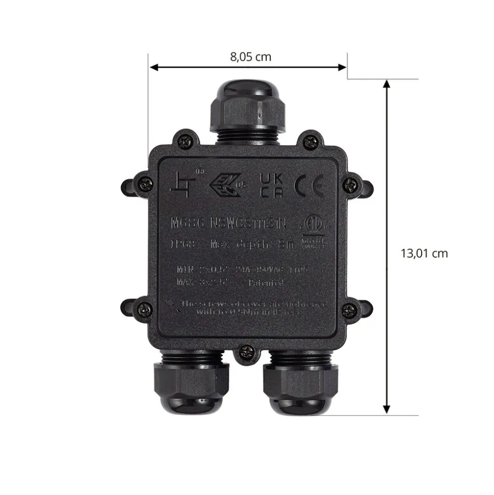 Koblingen i elegant svart gir en pålitelig og holdbar løsning for utendørs belysning. Med en kapslingsgrad på IP68 er denne koblingen optimalt beskyttet mot inntrengning av vann og støv, noe som gjør den ideell for bruk på terrasser og i andre krevende miljøer. Det robuste plastmaterialet, som oppfyller UL94V-2-standarden, sikrer høy holdbarhet og sikkerhet.