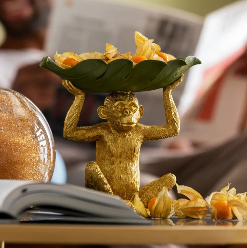 Dekorativ skål Banana Leaf laget av polyesin, lakkert og håndmalt Denne spotlight vakre hjelperen har alt under kontroll: Den dekorative skålen Banana Leaf kan brukes til å oppbevare nøkler, ringer eller snacks til en filmkveld, og den vennlige apen holder alt ryddig. Skulpturen er detaljert og kjærlig håndmalt. Med den gullfargede, malte apen og den grønne skålen gir pyntegjenstanden en jungelfølelse til stuen, soverommet, gangen eller hjemmekontoret.