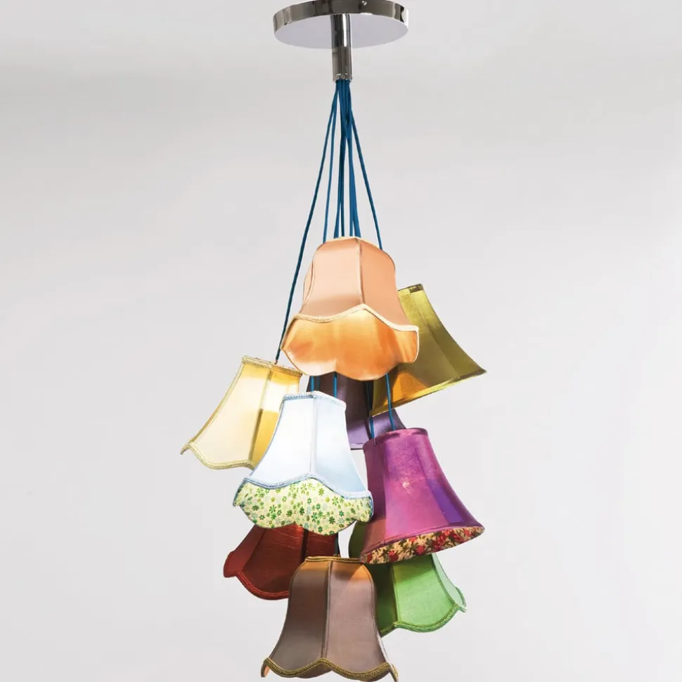 Fargerik SALOON FLOWER hengelampe med ni skjermer i forskjellige farger Du kan bli fristet til å tro at det er fargerike skjørt som svirrer rundt her. Du tar kanskje ikke feil, for hengelampen heter absolutt ikke SALOON FLOWER ved en tilfeldighet. Enten du tenker på 1920-tallets saloon eller føler deg minnet om saloonen i det ville vesten, danset man og nøt det fargerike livet i begge deler. Innsiden av de klassisk designede skjermene, hvorav noen er dekorert med blomstermønstre, er spesielt attraktive.