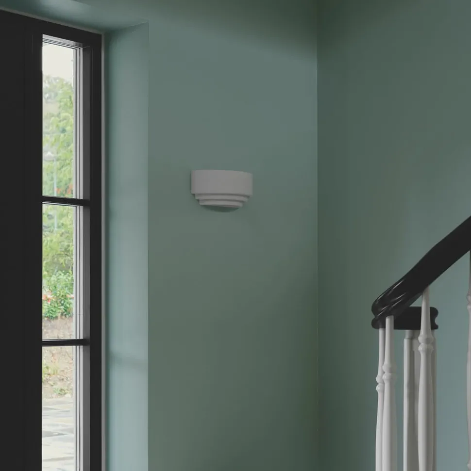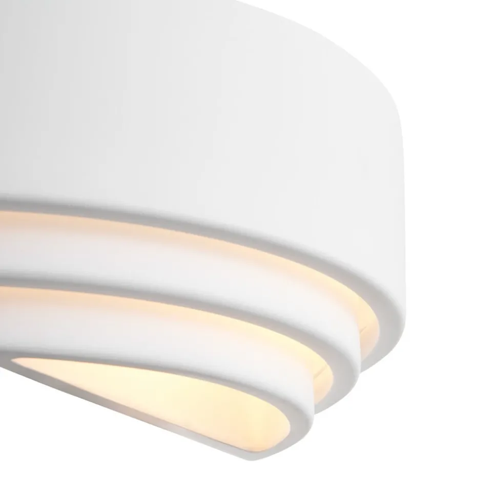 Lancio Oblong vegglampe i gips Lancio Oblong vegglampe er laget av gips med en avrundet form og et flerlagsutseende. Pæren (ikke inkludert) lyser både oppover og nedover gjennom mellomrommene mellom de enkelte lagene, noe som skaper stemningsfulle lyseffekter. Lampen er utstyrt med en kabel med støpsel. Den kan derfor kobles enten til en stikkontakt eller, med kabelen fjernet, direkte til en strømtilkobling på veggen.