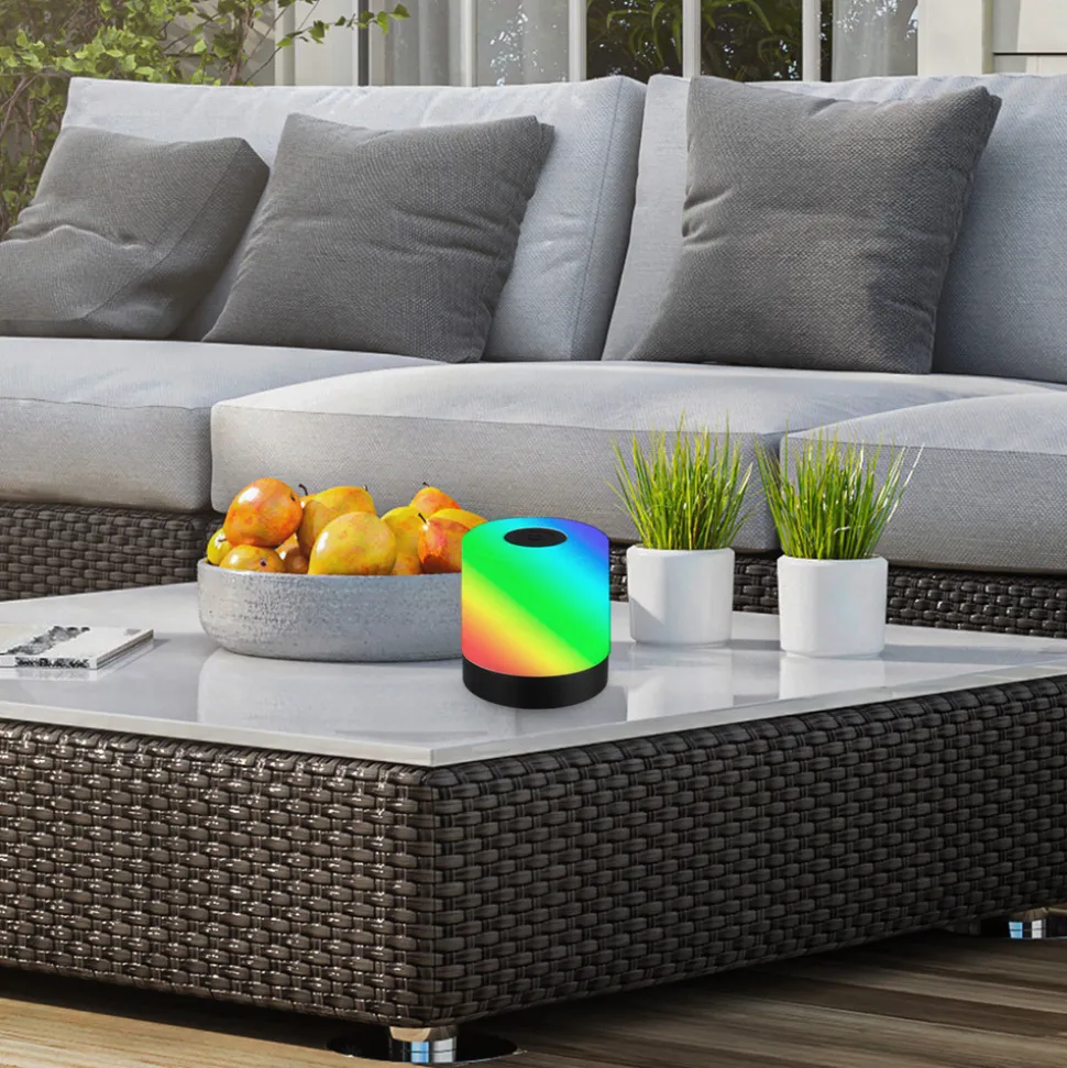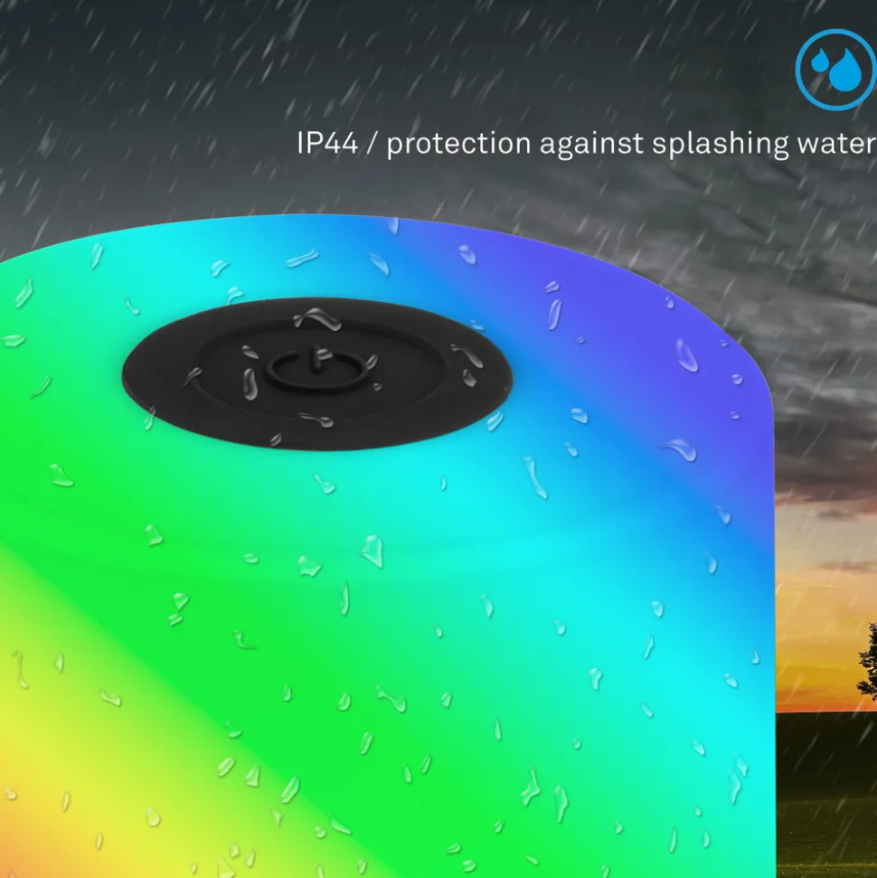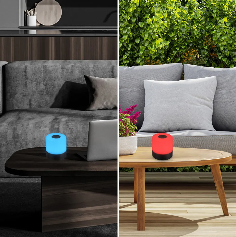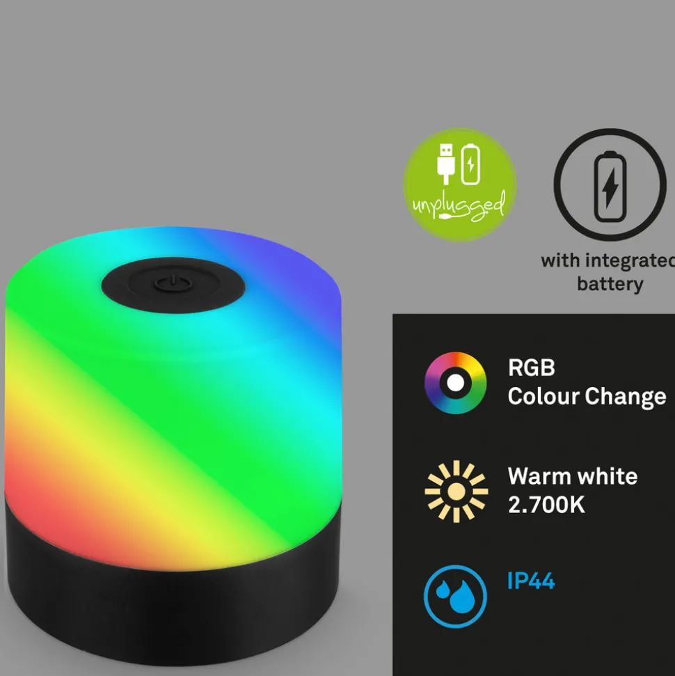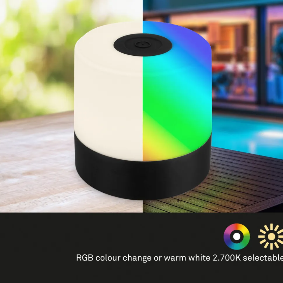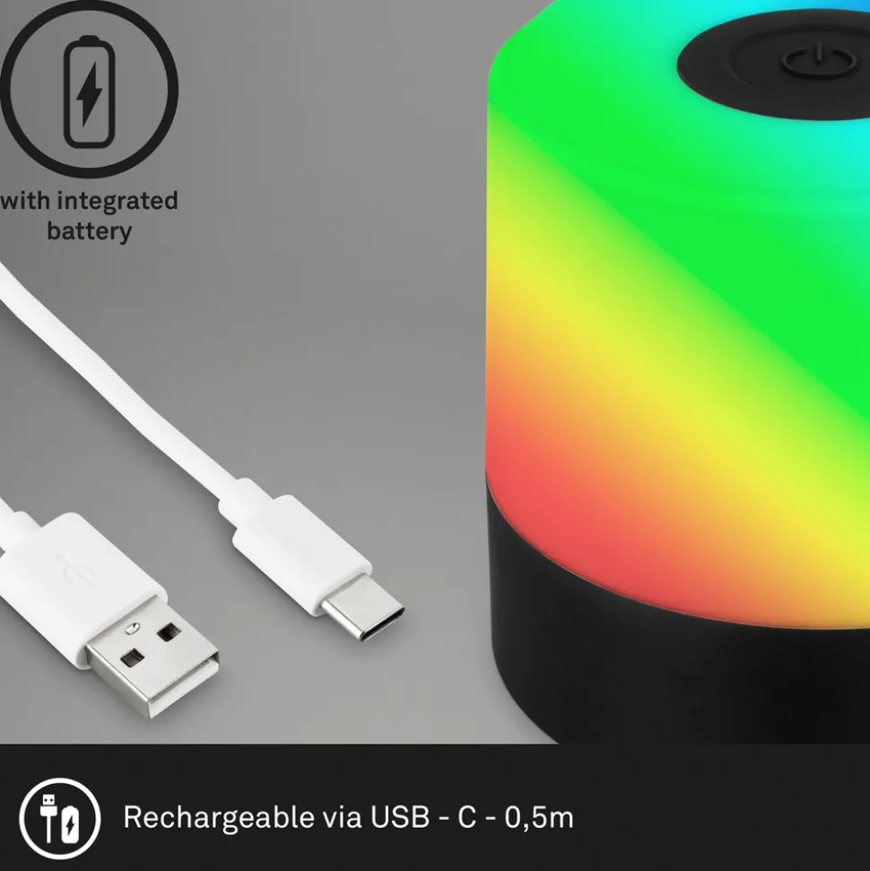 LED-bordlampe 74620 med oppladbart batteri, RGB-fargeskifte og varmhvitt lysDenne lille LED-bordlampen med integrert oppladbart batteri gir enten varmhvitt eller farget lys, både med fargeskifte og konstant farge. Lampen er laget av plast og slås av og på med bryteren som er integrert i sokkelen. Ved å berøre sensorbryteren på toppen av lampen kan du stille inn varmhvitt lys med én berøring, gjentatte berøringer slår på fargeskiftet, den tredje berøringen stopper fargeskiftet i ønsket farge og den fjerde berøringen slår lampen av.Leveransen inkluderer en USB-ladekabel uten støpsel eller en nettadapter for lading av batteriet.
