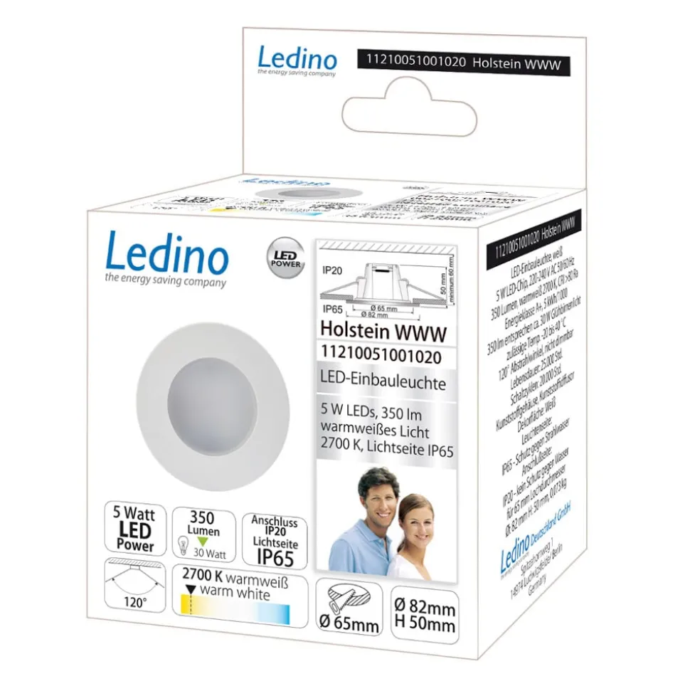 Holstein rund LED innfelt taklampe for utendørs bruk, fast integrert modul Holstein LED innfelt taklampe gir behagelig, varmhvit allmennbelysning i en passasje, et inngangsparti eller langs en fasade. Den er laget av plast i en rund form og har en lysspredende, opal skjerm. Den kan monteres i taket eller på veggen, avhengig av ønsket bruksområde – Innbyggingsdybde: min. 6 cm – Kapslingsgrad: IP65 – Tilstrekkelig tetning kreves (IP20 bak) – Utstrålingsvinkel: 116° – Utstyrt med monteringsfjærer