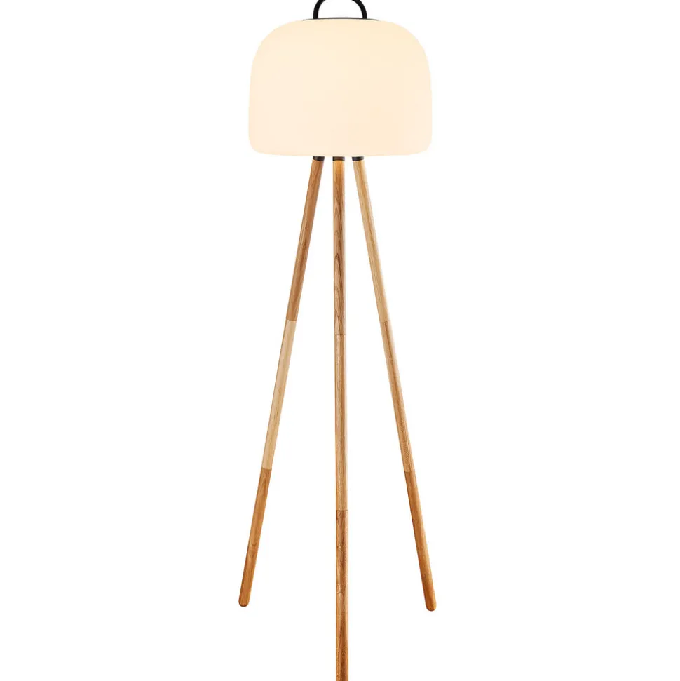 Hjemmets terrasse eller balkong, samt gastronomiske uteområder eller utenfor andre forretningssteder kan fortrylles med LED-gulvlampen Kettle tripod uten strømforbindelse, siden lampen er utstyrt med et oppladbart batteri og ladekabelen følger med. De varmhvite LED-lysene som er installert på den hvite plastskjermen, kan byttes til tre lysstyrkenivåer ved å aktivere den flere ganger for å justere et sterkere eller mer subtilt lys, avhengig av stemningen. Når batteriet er fulladet, varer lyset ved 100 % batter i fem timer, med en lysstyrke på 60 % i opptil 10 timer og 30 % i opptil 15 timer.