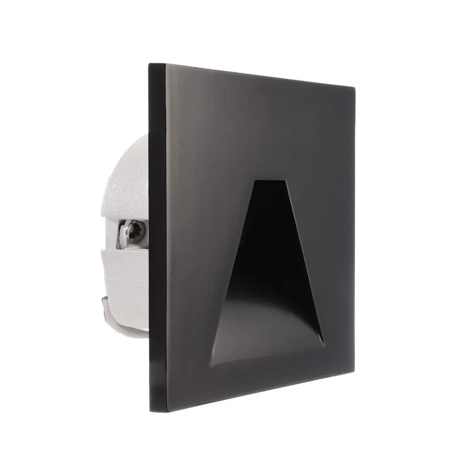 LED innfelt vegglampe SET Alwaid, kantet linse med kantet lysutslipp – for 68 mm koblingsbokser Den innfelte vegglampen SET Alwaid er ideell for aksent- og orienteringsbelysning langs korridorer, kjellere og trapper. Den er designet for montering i 68 mm koblingsbokser med normal og dyp design. Innbyggingslampen SET Alwaid er laget av aluminium og utstyrt med et kvadratisk deksel med vinklet lysutslipp (trapesformet avsmalning på toppen).