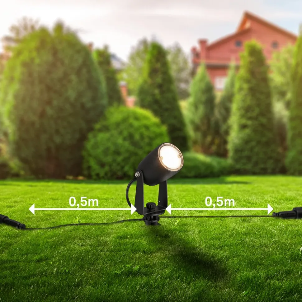 Forlengersett for 12 V utelamper – tre runde LED-spot med jordspyd Ø 4 cm Dette settet med tre varmhvite LED-spot med jordspyd brukes til å forlenge 12 V LED-utelampen fra Briloner. Det runde lampehodet er svingbart montert i rammen. Jordspydet gjør det enkelt å forankre spotlightene i løs jord. Spottene har egnede tilkoblingskabler med pluggkontakter for 12 V-systemet. En utendørs plug-in-transformator for 230 V-tilkobling til stikkontakten er ikke inkludert – et startsett (se tilbehør) er nødvendig – Forlengelsessett med tre lyskastere og 12 V-tilkoblingskabler – Eksklusiv plug-in-transformator – Kapslingsgrad: IP65
