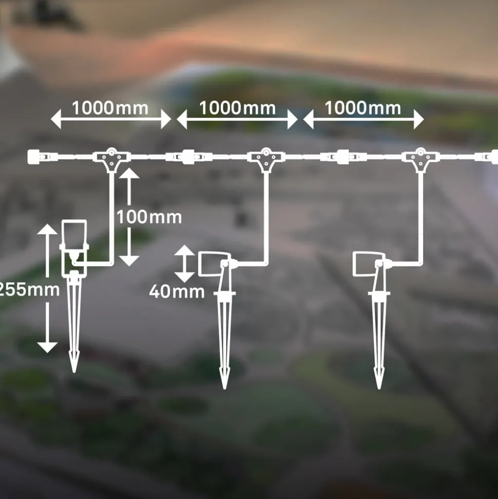 - tre lamper med jordspyd (12 V) med inngangskabel (12 V) og utgangskabel (12 V)