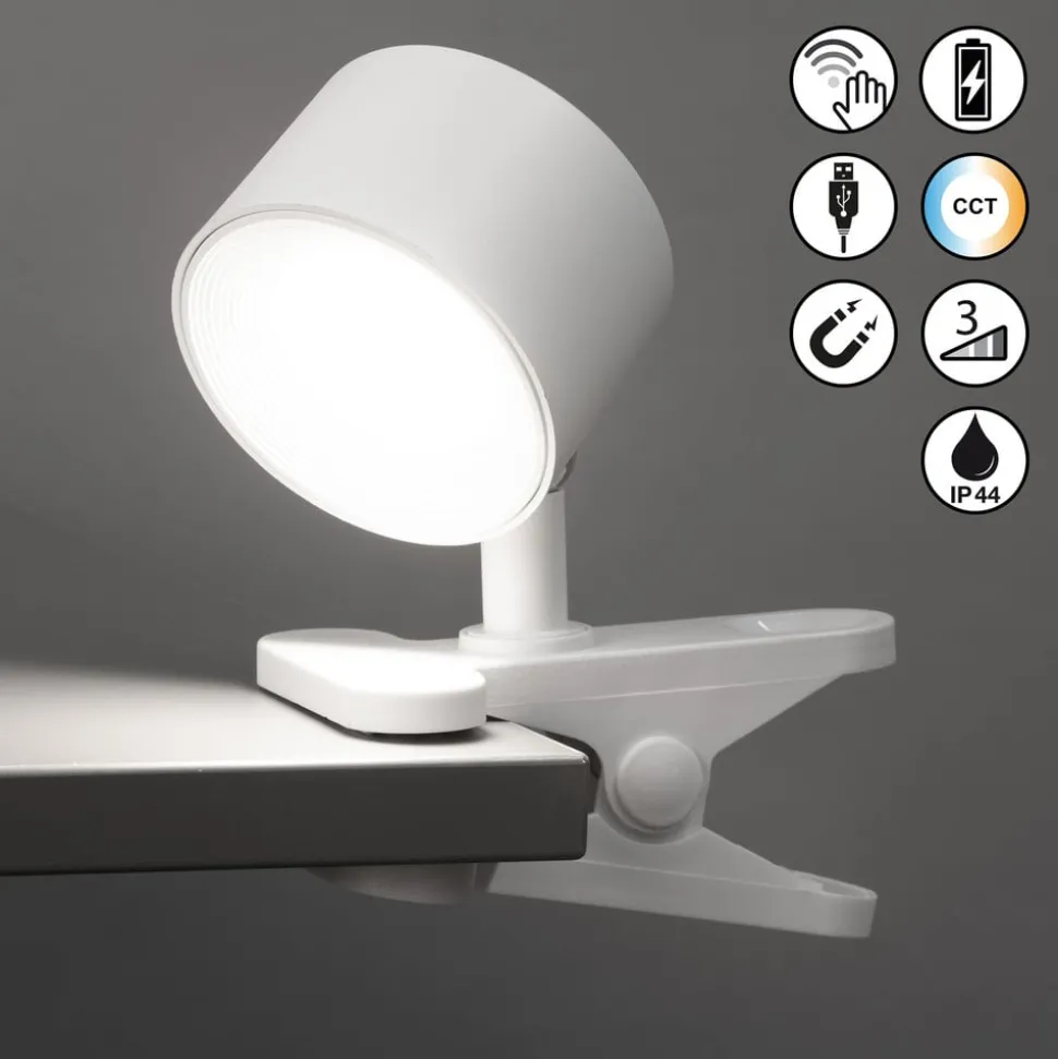 Uvanlig LED-klemmelampe Magnetics med Tunable White-funksjon Den lille, fleksible LED-klemmelampen Magnetics med oppladbart batteri i enkel design imponerer spesielt med sine fleksible bruksmuligheter. Lampen festes med en magnet og klemme og kan enkelt lades ved hjelp av den medfølgende USB-kabelen, mens den er helt selvforsynt i batterimodus. Den er også utstyrt med en sensordimmer som gjør det mulig å dimme i 3 nivåer (100 % – 50 % – 25 %). Takket være den justerbare hvitfunksjonen kan du dessuten velge mellom 2700 K, 4000 K og 5700 Kelvin.