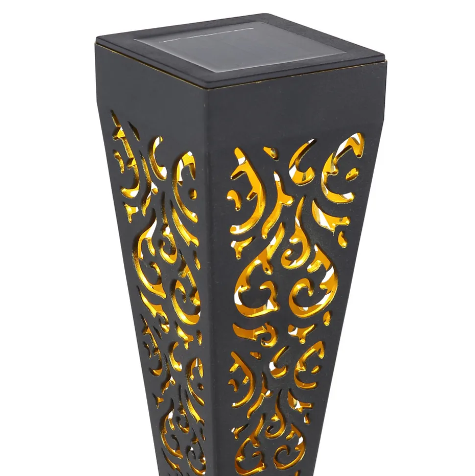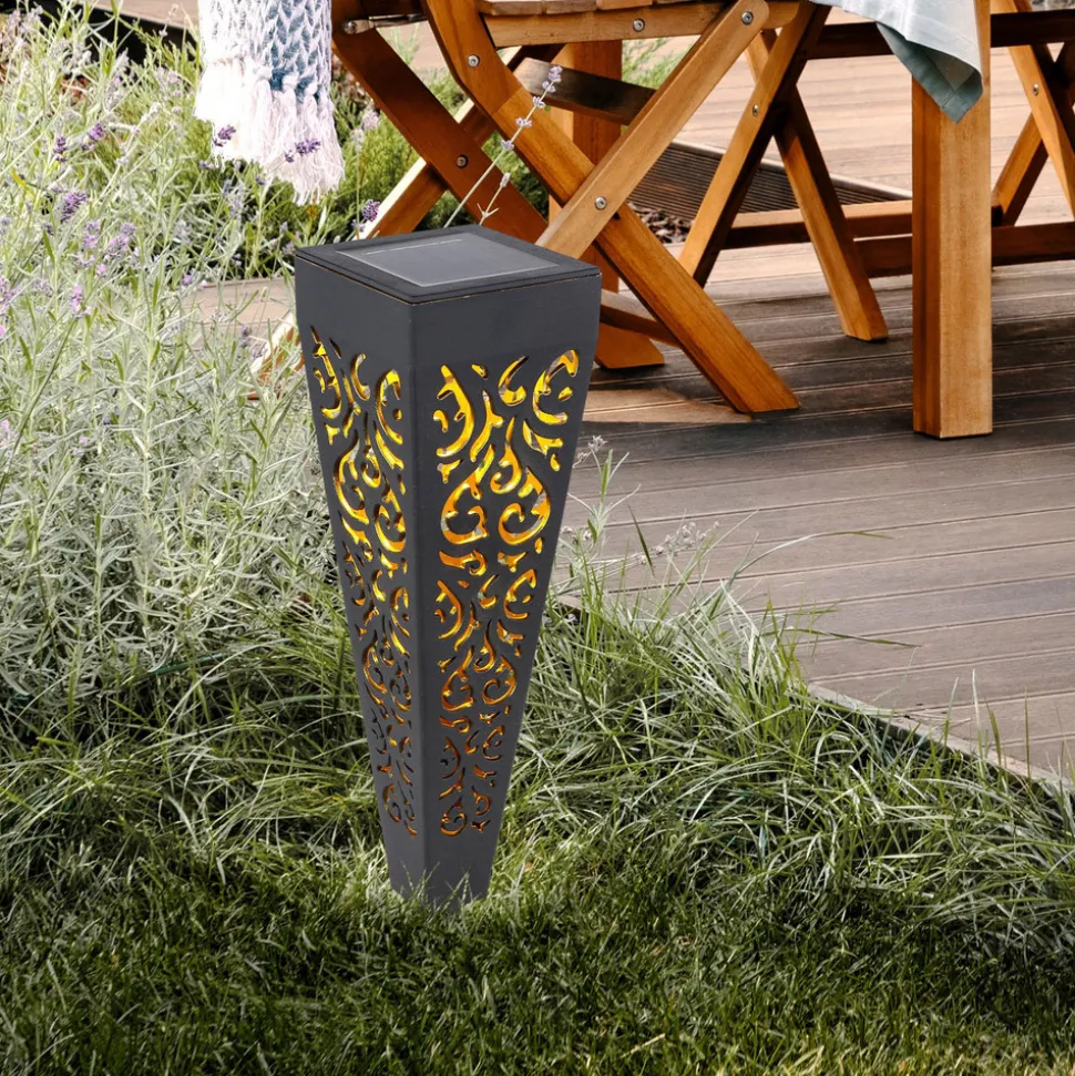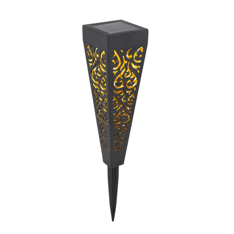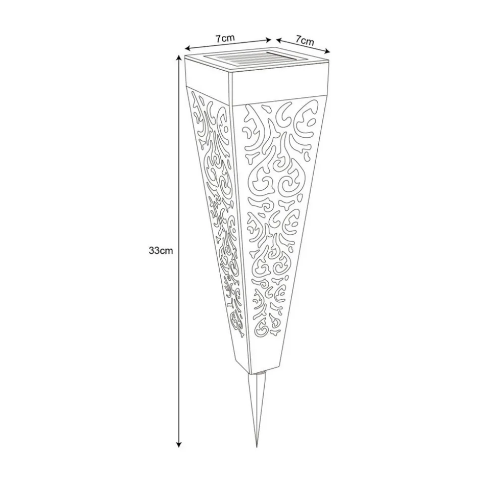LED-lampe med jordspyd 33578-3 i sett med 3 Denne solcellelampen i svart plast (kapslingsgrad IP44) i et sett med 3 er ideell for enhver hage. Den 33 cm høye solcellelampen kan enkelt plasseres i mykt underlag, for eksempel på engen, ved hjelp av jordspydet. Solcellene er plassert på den firkantede toppen (7×7 cm) og samler energi i seks til åtte timer i løpet av dagen. Solcellelampen blir smalere mot bunnen, slik at den kan projisere et elegant mønster på bakken.