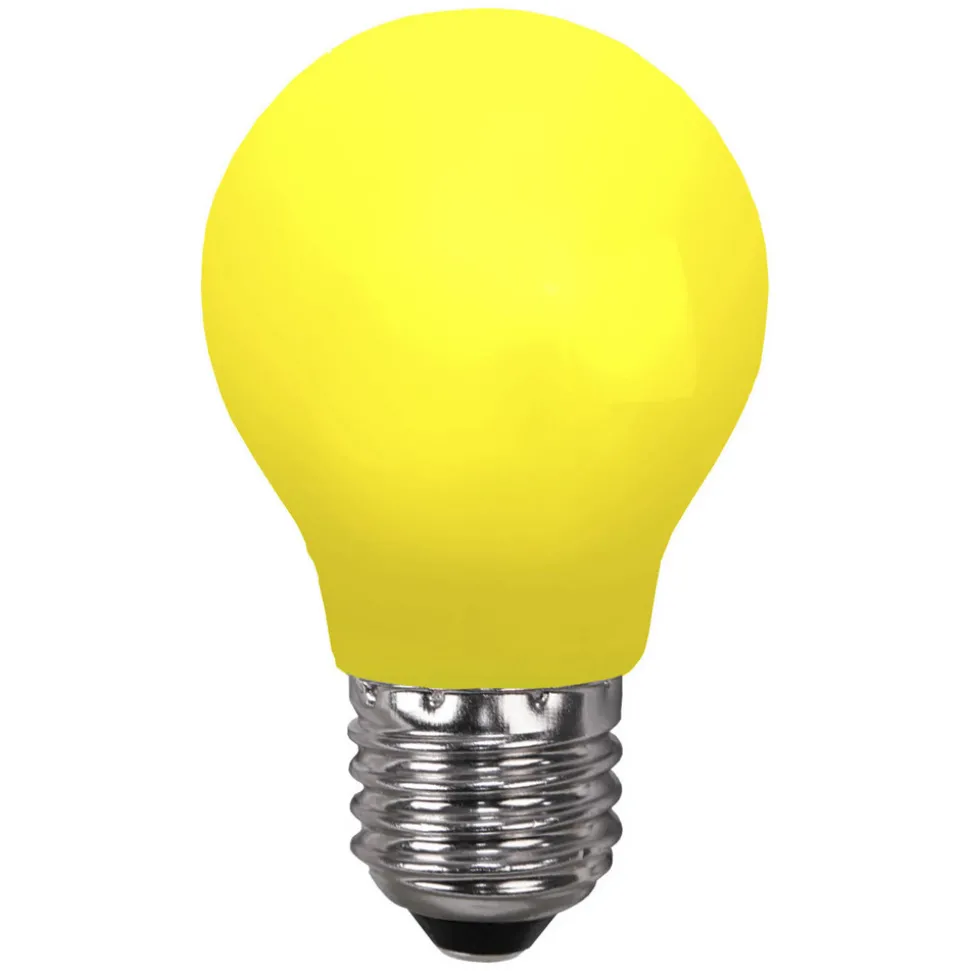 Farget E27 LED-pære av splintsikkert polykarbonat Denne LED-pæren med en farget kropp av splintsikkert polykarbonat er et utmerket valg til LED-lyslenker. Fra festlokalet til et telt i hagen, en LED-lyslenke med E27-fatning kan utstyres med disse fargerike og holdbare LED-pærene for å lyse opp stedet på en stemningsfull måte. Funksjoner: – Kan brukes i temperaturer fra -20 til +40 °C – Laget av splintsikkert polykarbonat