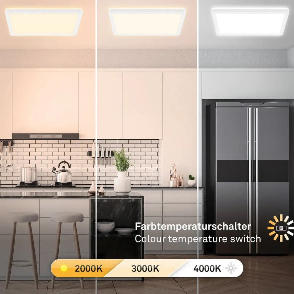Kvadratisk LED-panel 7556/7558 med bakgrunnsbelysning og justerbar lysfarge Dette LED-panelet har tre ulike lysfarger som kan velges med en glidebryter på baksiden. Panelet er laget av plast, og den fleksible lysfargen gjør at det kan brukes i mange forskjellige rom. De innebygde LED-lampene stråler ut lyset jevnt gjennom satengdiffusoren, og på grunn av bakgrunnsbelysningseffekten stråler en del av lyset også oppover og skaper en ring av lys rundt armaturen. – Valgbare lysfarger: Varmhvit (2 000 K), varmhvit (3 000 K), universalhvit (4 000 K)